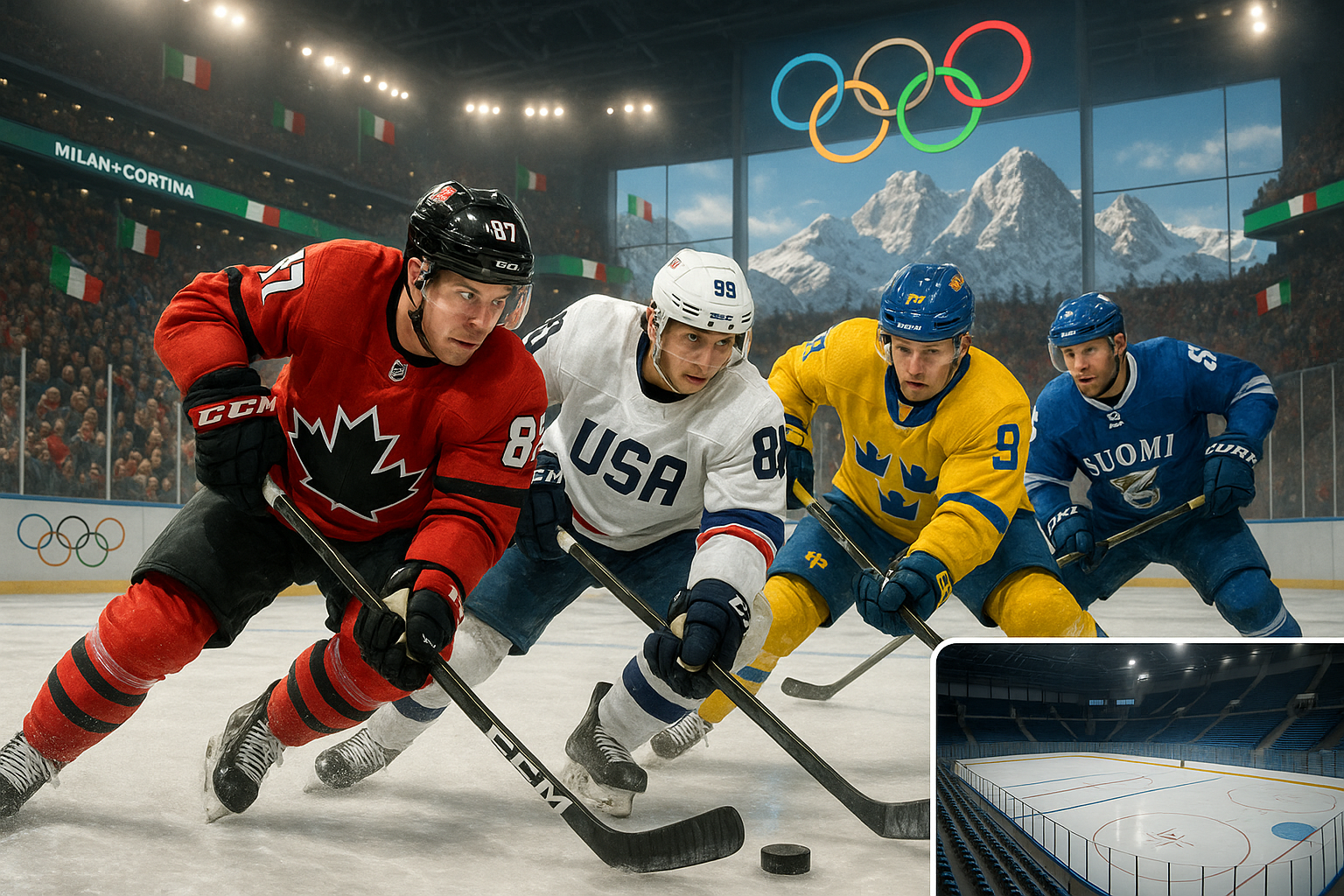NHL players in national jerseys compete fiercely in Olympic hockey at Milan-Cortina 2026, with snowy Alps backdrop and paused NHL season inset.