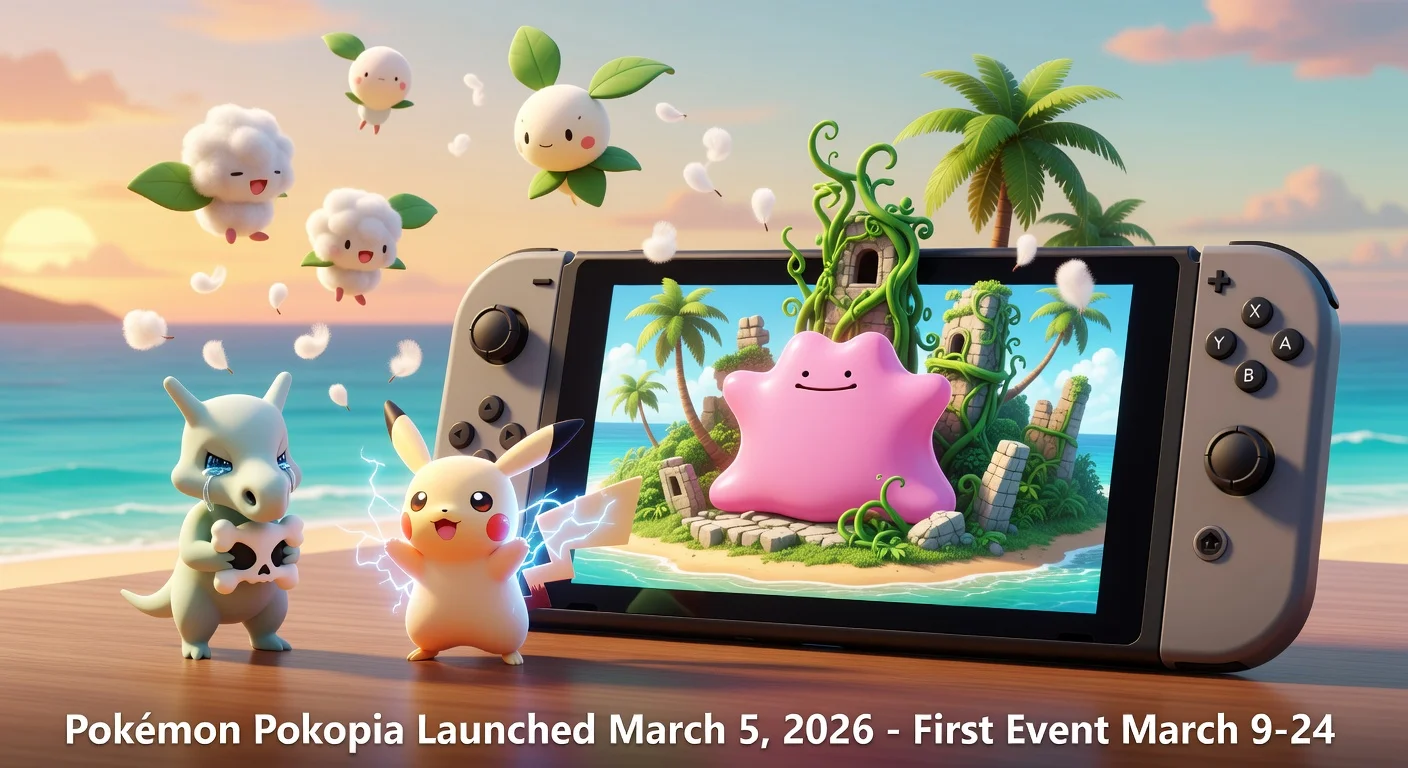 Pokémon Pokopia, a new life simulation game, released on March 5, 2026, for Nintendo Switch 2, allowing players to rebuild an island as a Ditto to attract Pokémon companions. The game features poignant backstories for creatures like Cubone and Peakychu. Its debut post-launch event introduces Hoppip, Skiploom, and Jumpluff exclusively from March 9 to 24.