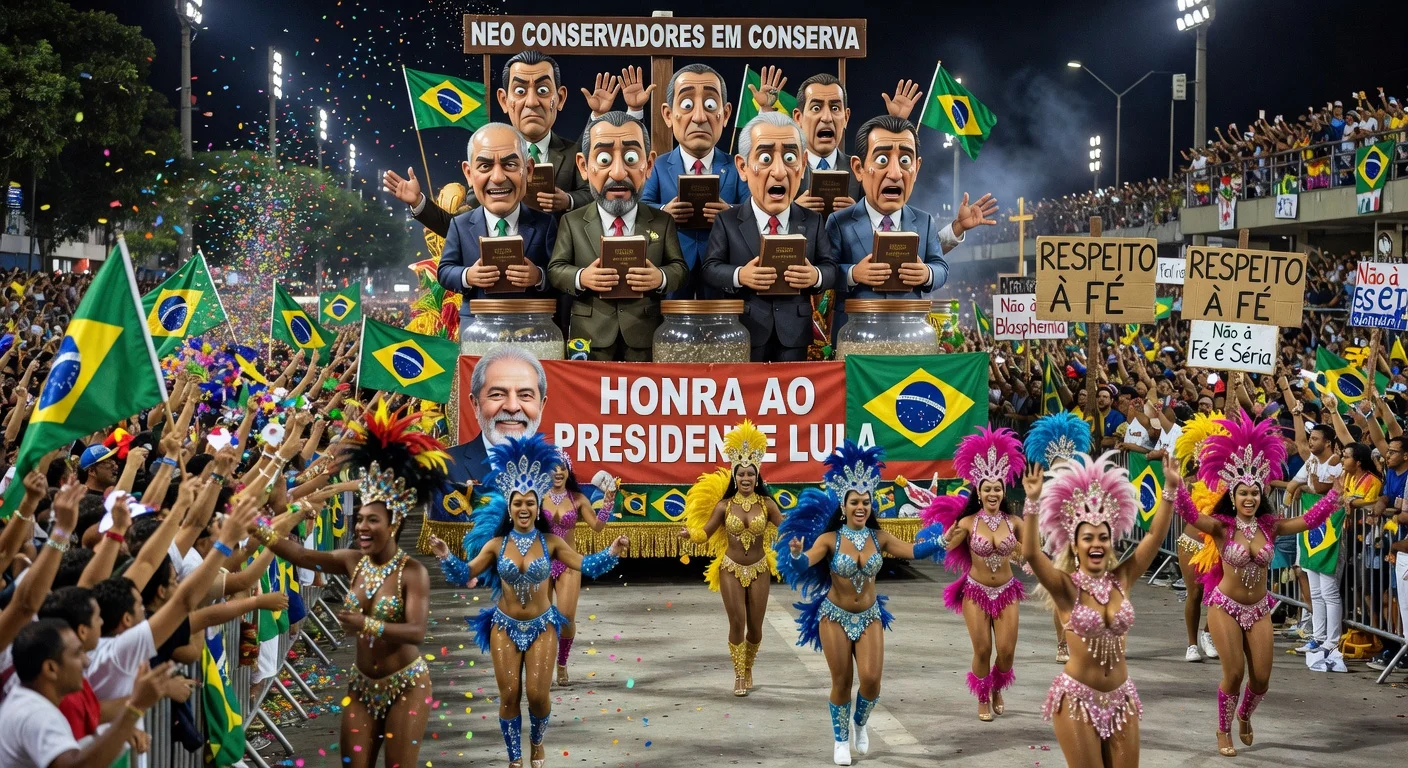 Photorealistic image of a controversial pro-Lula samba parade at Rio Carnival, featuring a satirical float targeting evangelicals and conservatives amid a divided crowd.