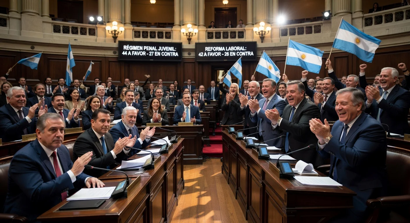 Argentina's Senate turned the new Juvenile Penal Regime into law, lowering the age of criminal responsibility to 14, with 44 votes in favor and 27 against, after seven hours of debate. It also approved the labor reform with 42 affirmative votes and 28 negative, incorporating changes from the Lower House that removed a controversial article on sick leave. The ruling party celebrated the advances, while the opposition criticized the measures as harmful to workers and human rights.