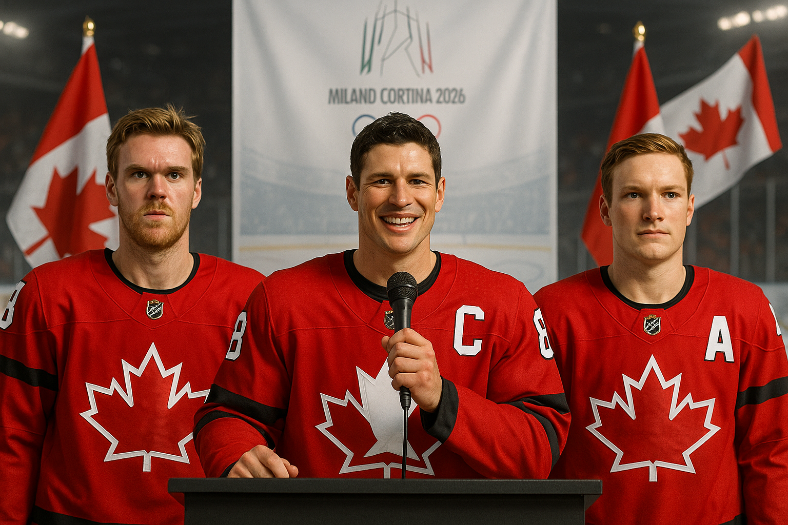 Sidney Crosby named captain of Team Canada for 2026 Olympics, with alternates Connor McDavid and Cale Makar at press conference.