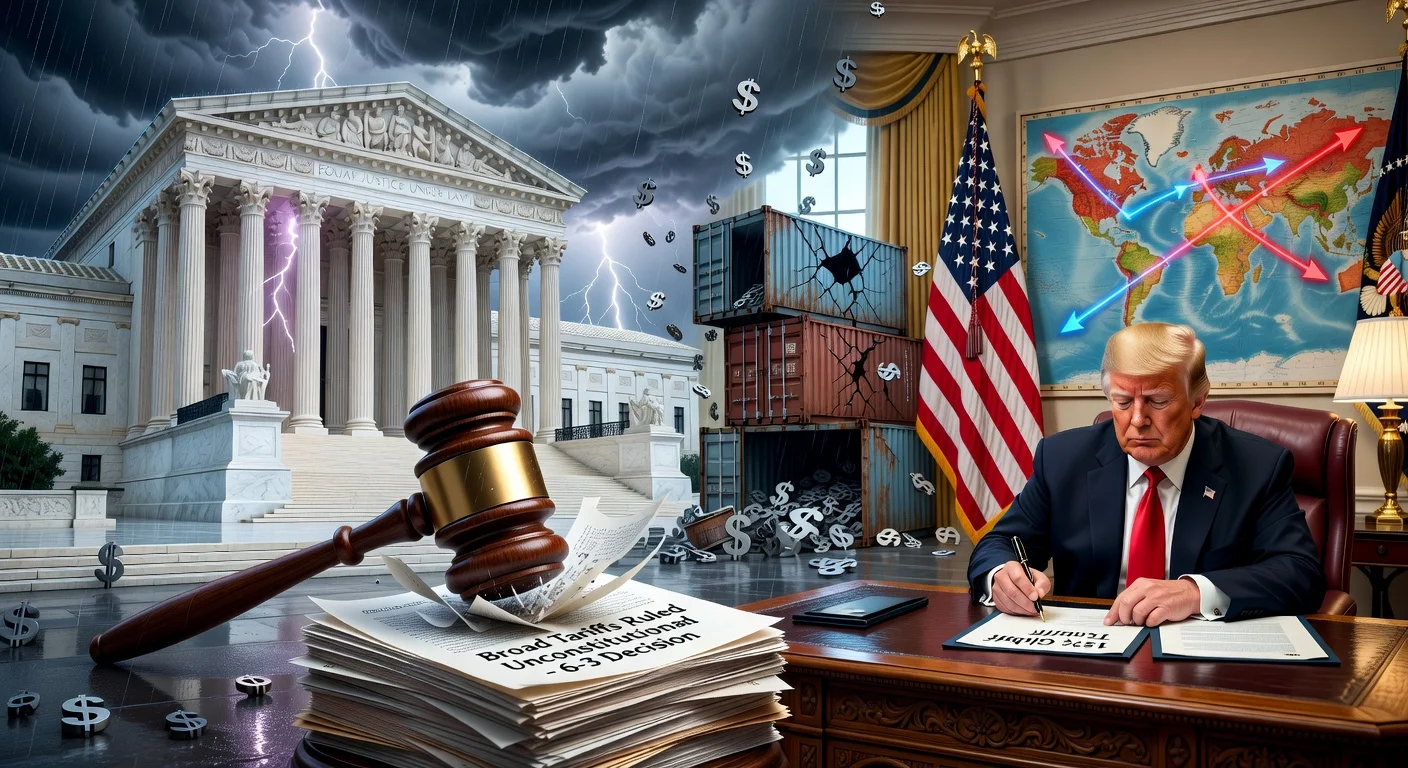 Illustration depicting Supreme Court striking down Trump's broad tariffs as he signs a new 15% global tariff order amid political drama.