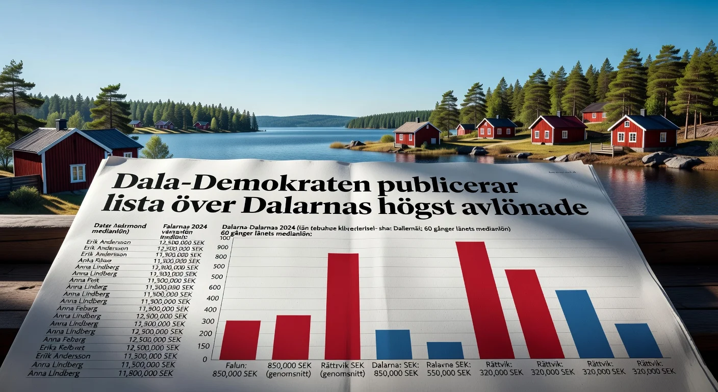 Realistic illustration of Dala-Demokraten newspaper front page listing Dalarna's highest earners from 2024 tax data, with charts showing income disparities against scenic Swedish backdrop.