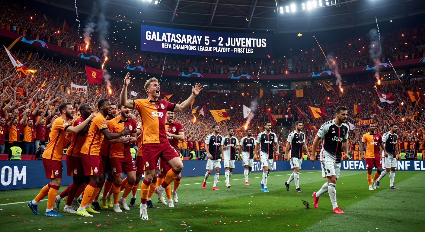 Galatasaray mounted a stunning comeback to defeat Juventus 5-2 in the first leg of their UEFA Champions League playoff tie in Istanbul. The Turkish side overturned a halftime deficit after Juventus' Juan Cabal was sent off, with Noa Lang scoring twice in the victory. The result puts Galatasaray in a strong position ahead of the return leg in Turin.