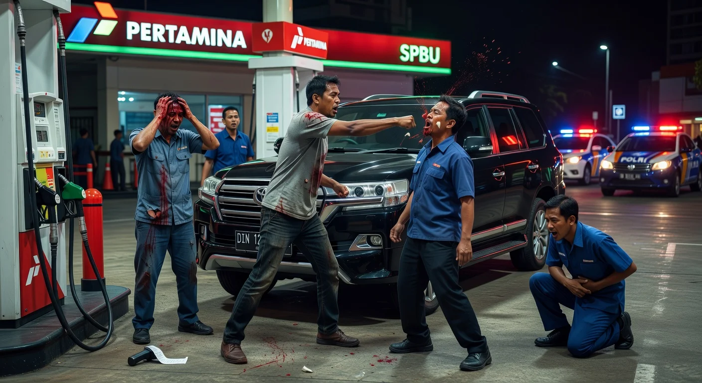 A man claiming to drive a general's car assaulted three SPBU workers in Cipinang, Pulogadung, East Jakarta, over a Pertalite barcode dispute. Victims suffered serious injuries including a broken tooth, while police are pursuing the suspect. The case is being handled seriously by Polda Metro Jaya to investigate potential involvement of rogue apparatus.