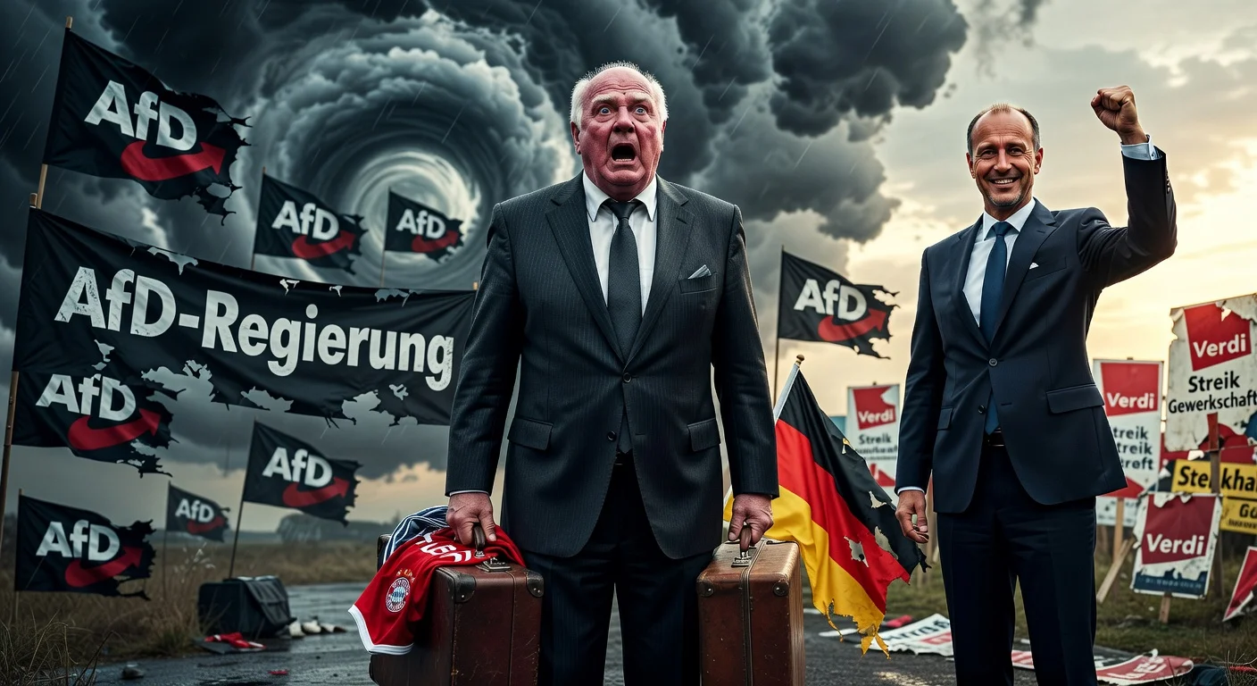 Uli Hoeneß horrified by AfD government nightmare vision, suitcase ready, contrasting praise for Chancellor Merz.
