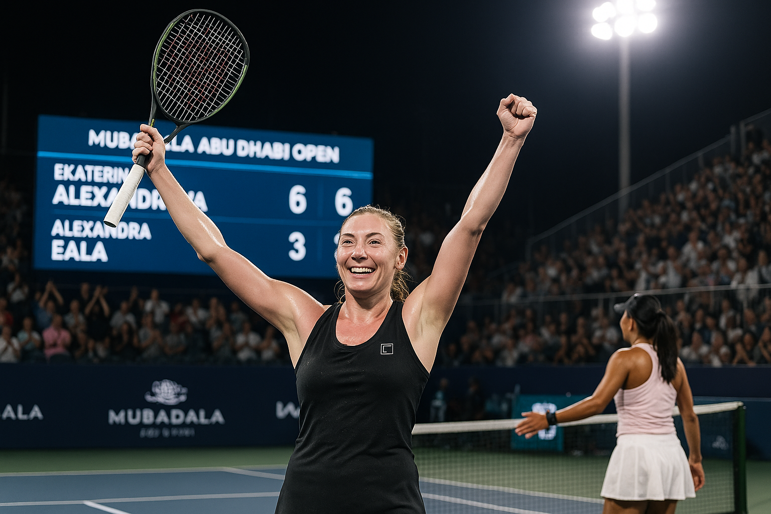 Ekaterina Alexandrova celebrates advancing to Abu Dhabi Open semifinals after defeating Alexandra Eala.