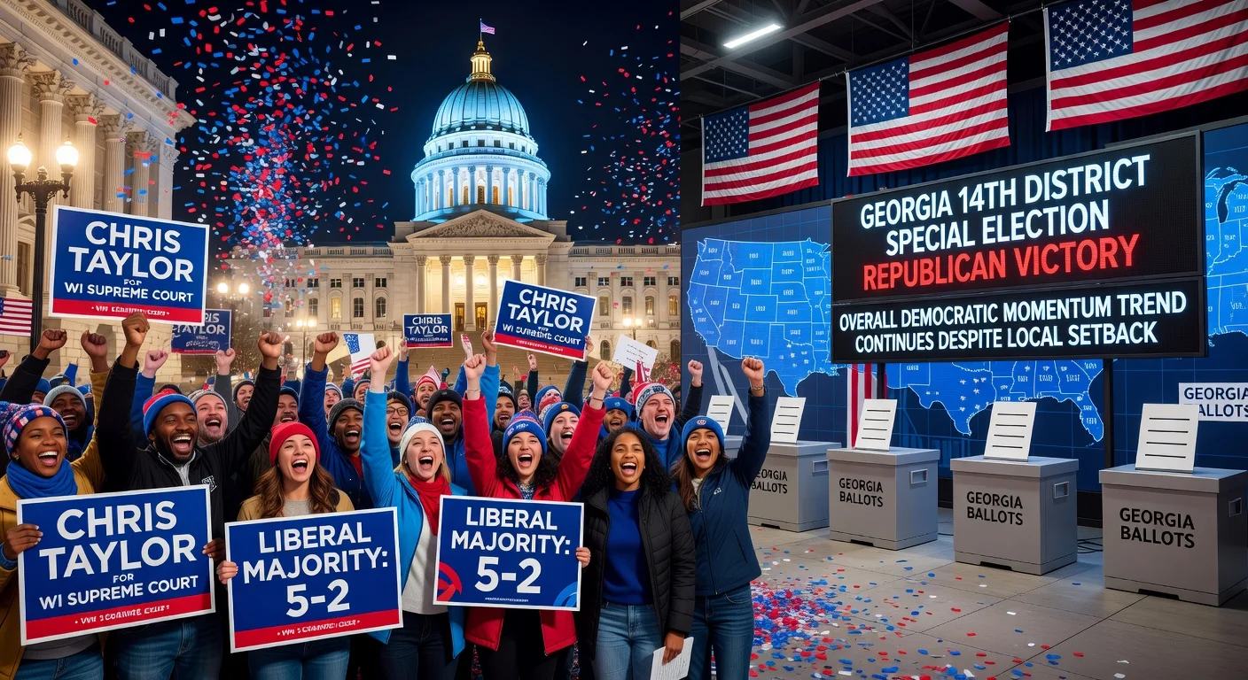 News illustration of election wins and results in Wisconsin Supreme Court race and Georgia special election, highlighting Democratic performance with celebrating crowds and maps.