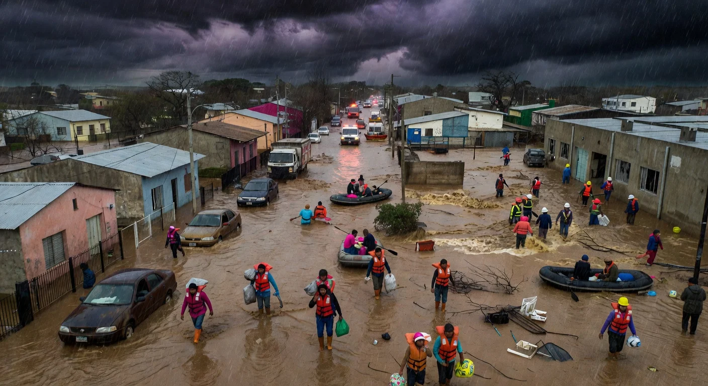 Flooded towns in Chaco province, Argentina, with submerged streets, stranded vehicles, evacuating residents, and heavy rain from extreme storm.