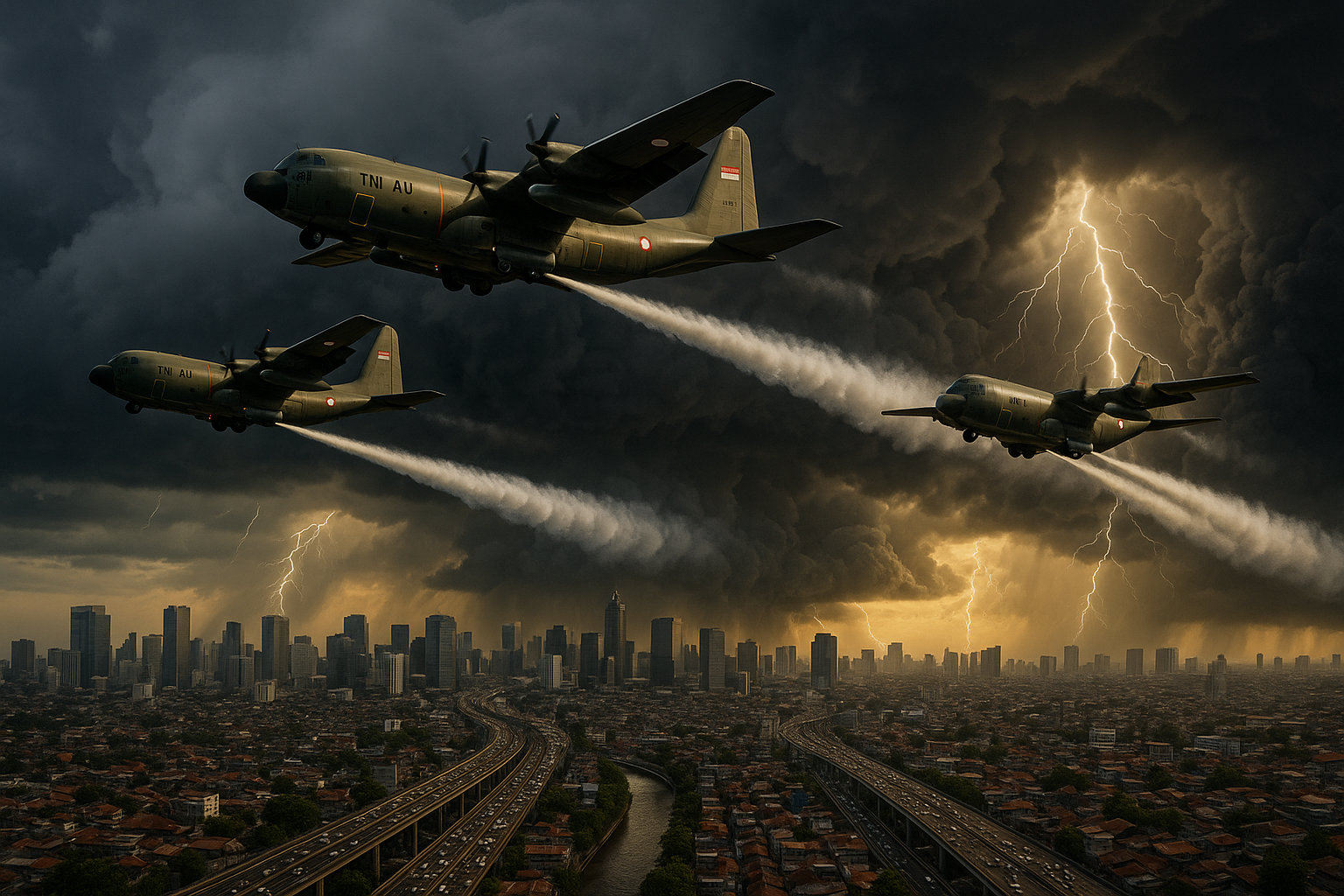 Indonesian Air Force planes seeding storm clouds with salt-lime over Jabodetabek to control rain and avert flooding.