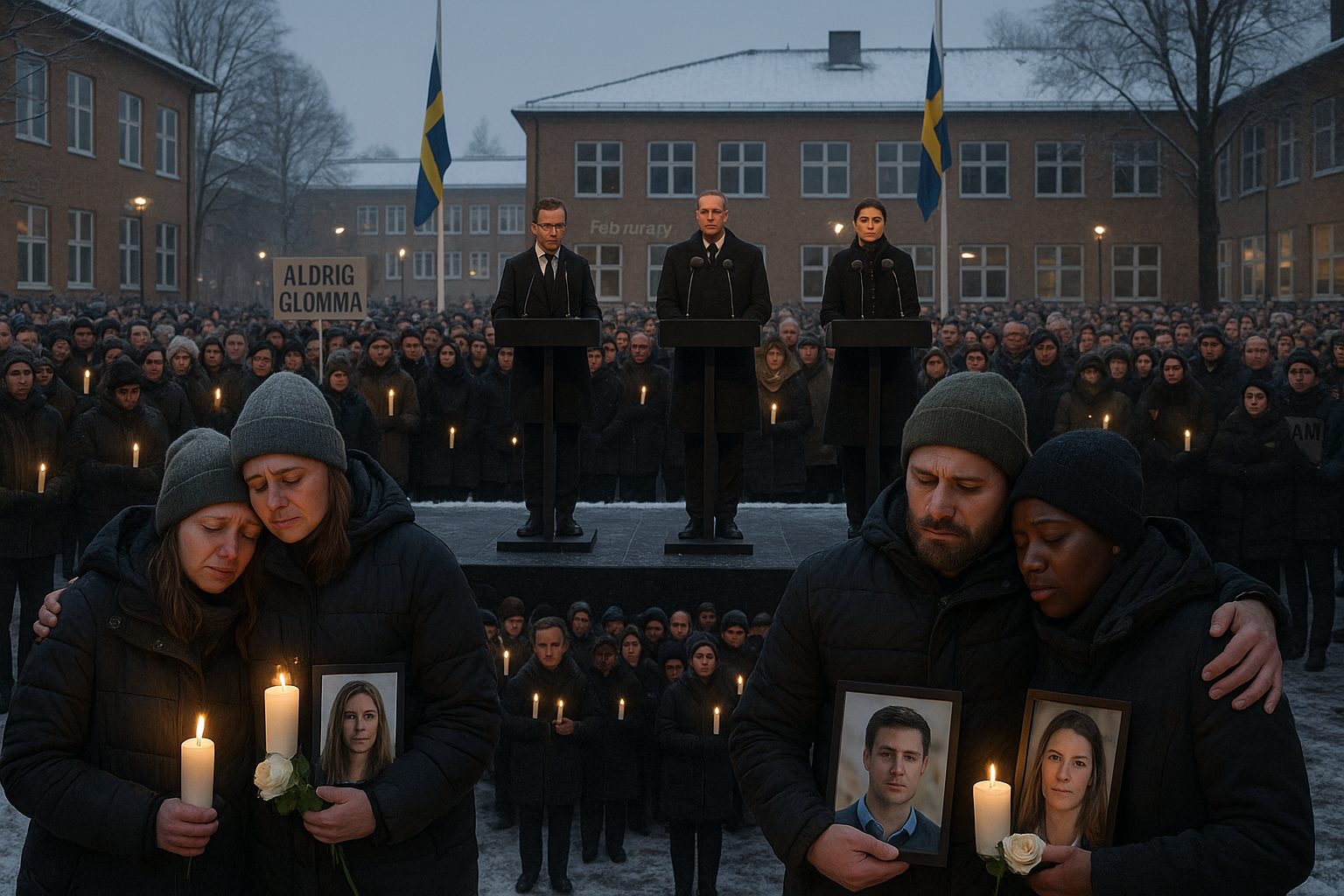 One year after the horrific mass shooting at Campus Risbergska in Örebro on February 4, 2025, commemorations took place across the city, featuring speeches by the governor, prime minister, and crown princess. Relatives and survivors reflect on grief and societal response, amid criticism of the police operation. The events were marked by warmth and unity despite ongoing pain.