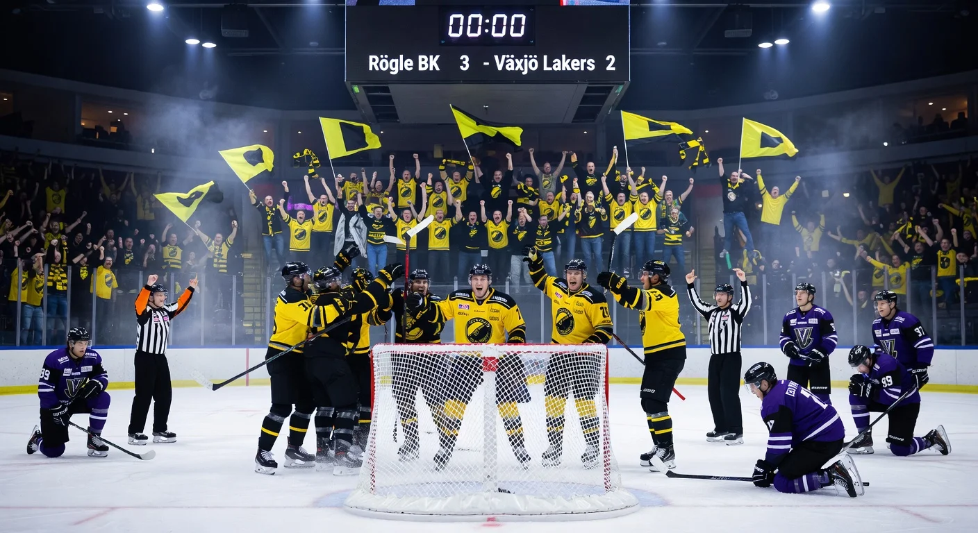 Rögle BK advanced to the SHL SM final after a dramatic 3-2 victory in game five of the semifinals at Vida Arena against Växjö Lakers, winning the series 4-1. Fredrik Olofsson's game-winner survived video review, while a late Växjö goal was disallowed. Rögle's defensive strength and goaltending set up a clash with Skellefteå starting April 23.