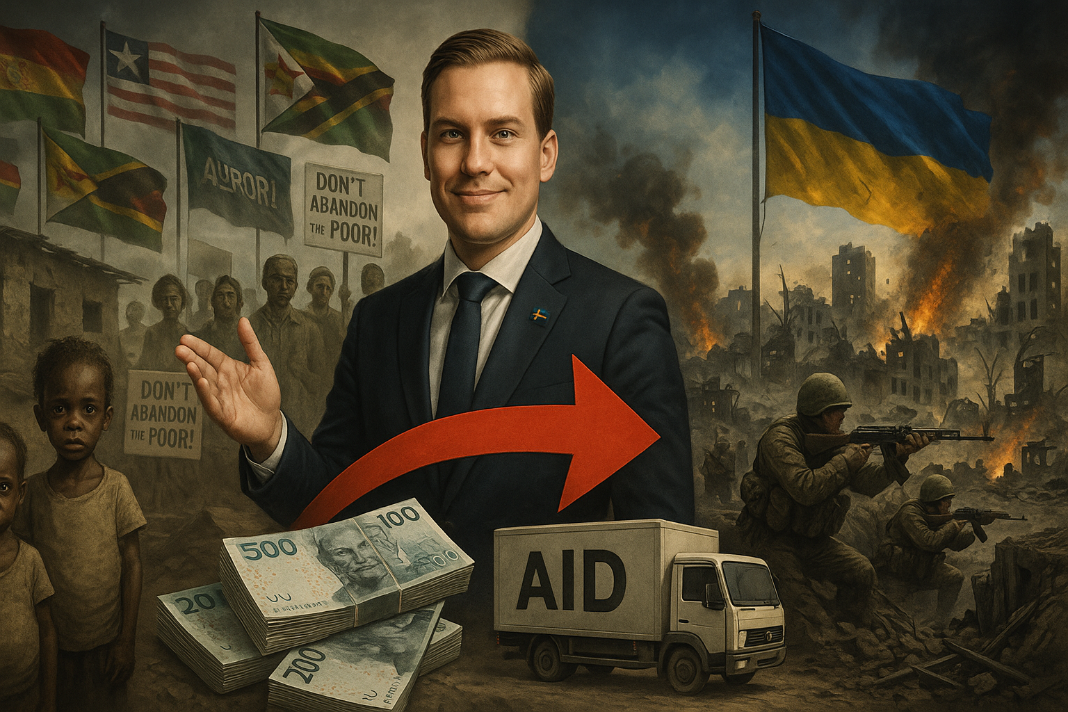 Illustration of Sweden redirecting foreign aid from five poor countries to war-torn Ukraine, amid controversy.