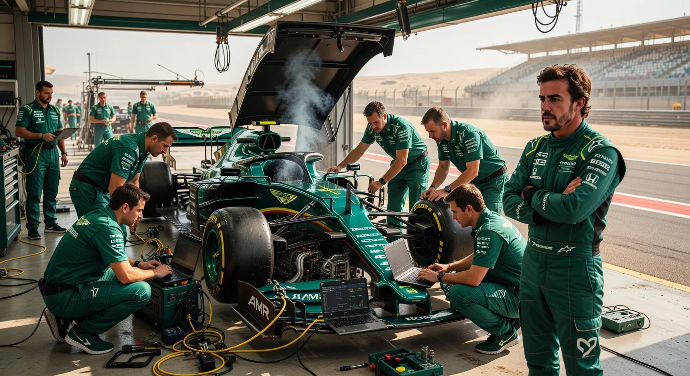 Aston Martin F1 pit crew troubleshoots car issues at Bahrain test while drivers Alonso and Stroll remain optimistic amid new leadership from Adrian Newey.