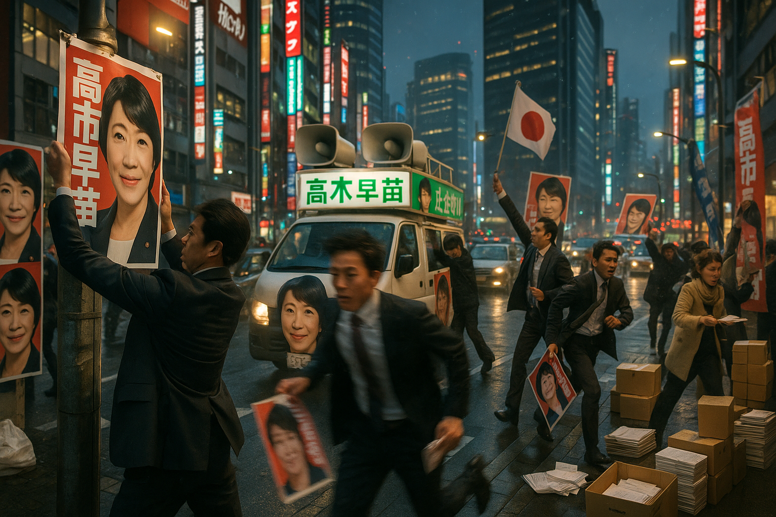 Workers and politicians rush to prepare posters and campaign materials on a Tokyo street for Japan's shortest post-WWII election campaign.