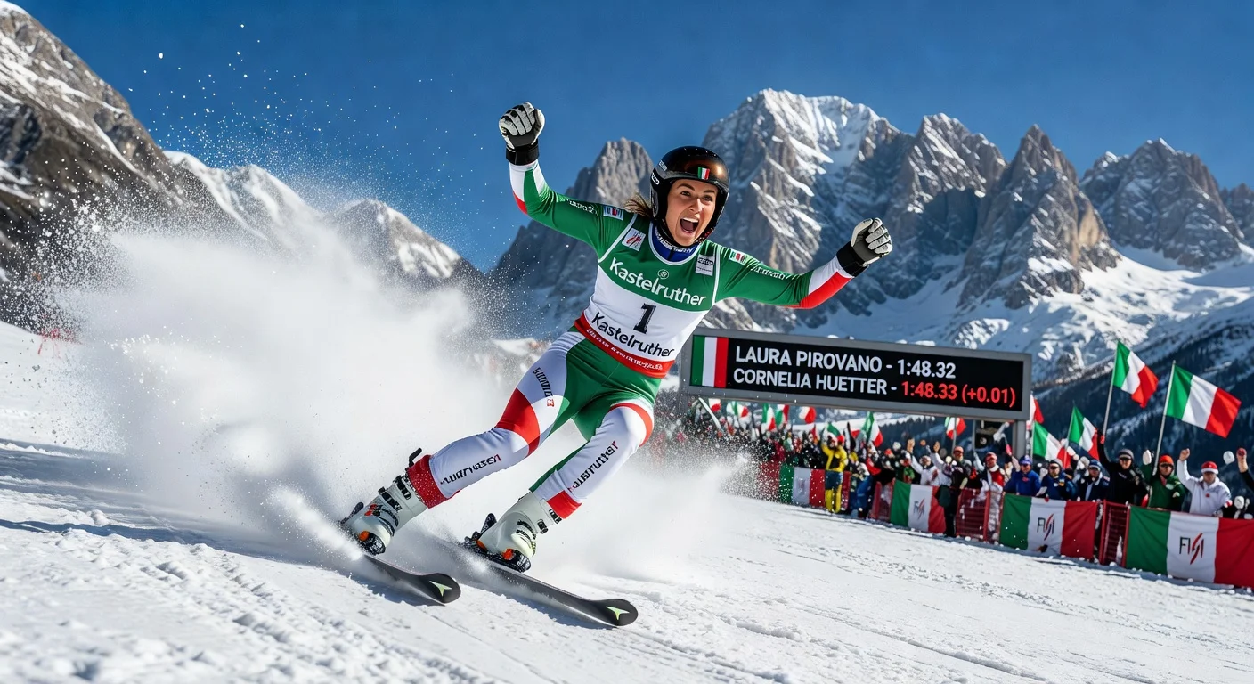 Reactions on X celebrate Laura Pirovano's back-to-back World Cup downhill victories in Val di Fassa by 0.01 seconds each, with fans and officials expressing excitement over her home wins and ascent to the standings lead ahead of injured Lindsey Vonn. High-engagement posts from sports accounts highlight her breakthrough, while some note the close races and impact on Vonn's title hopes.