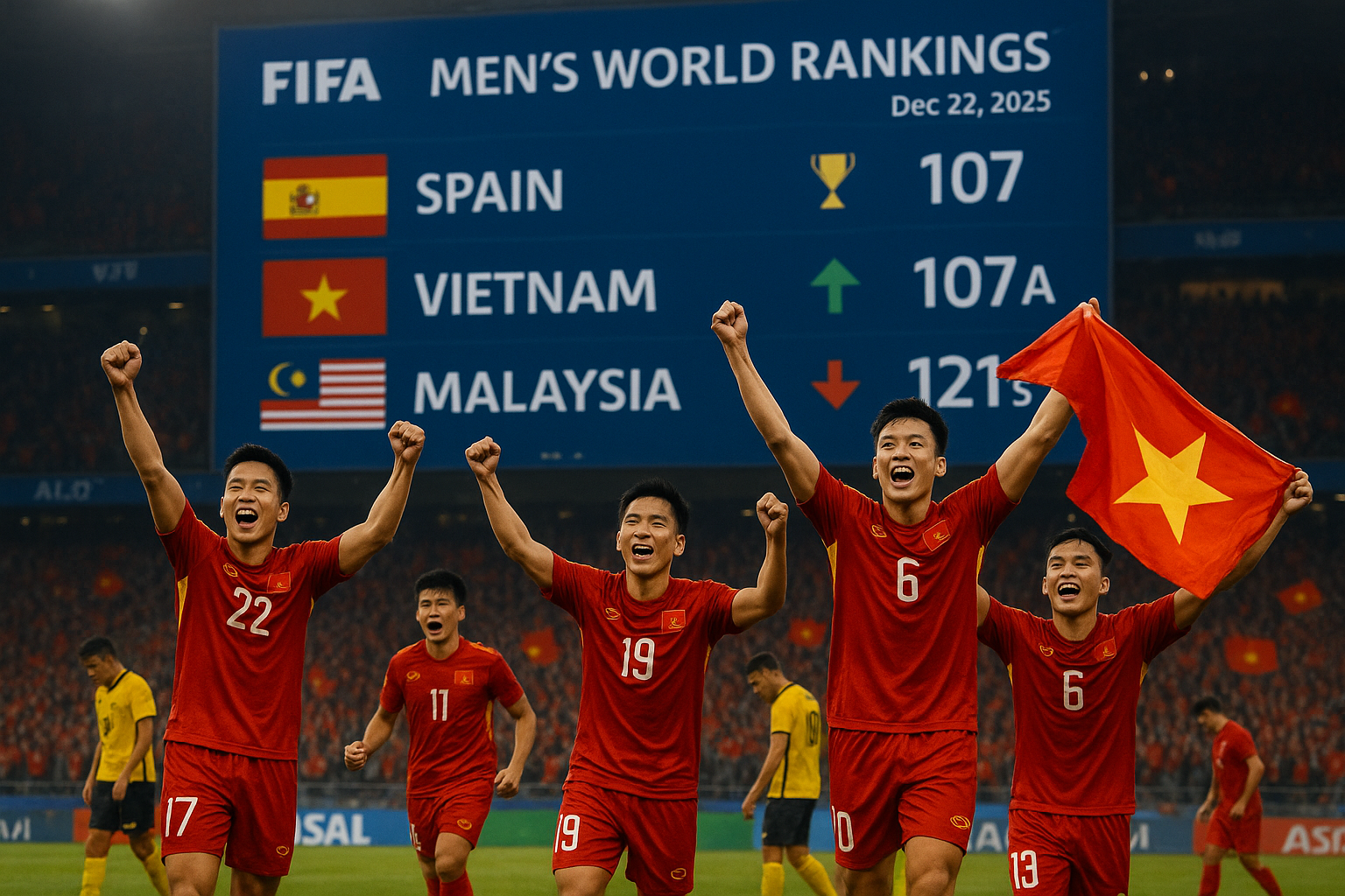 Dynamic illustration of Vietnam's FIFA ranking surge to 107th and Malaysia's drop to 121st, featuring celebrating players and rankings display.