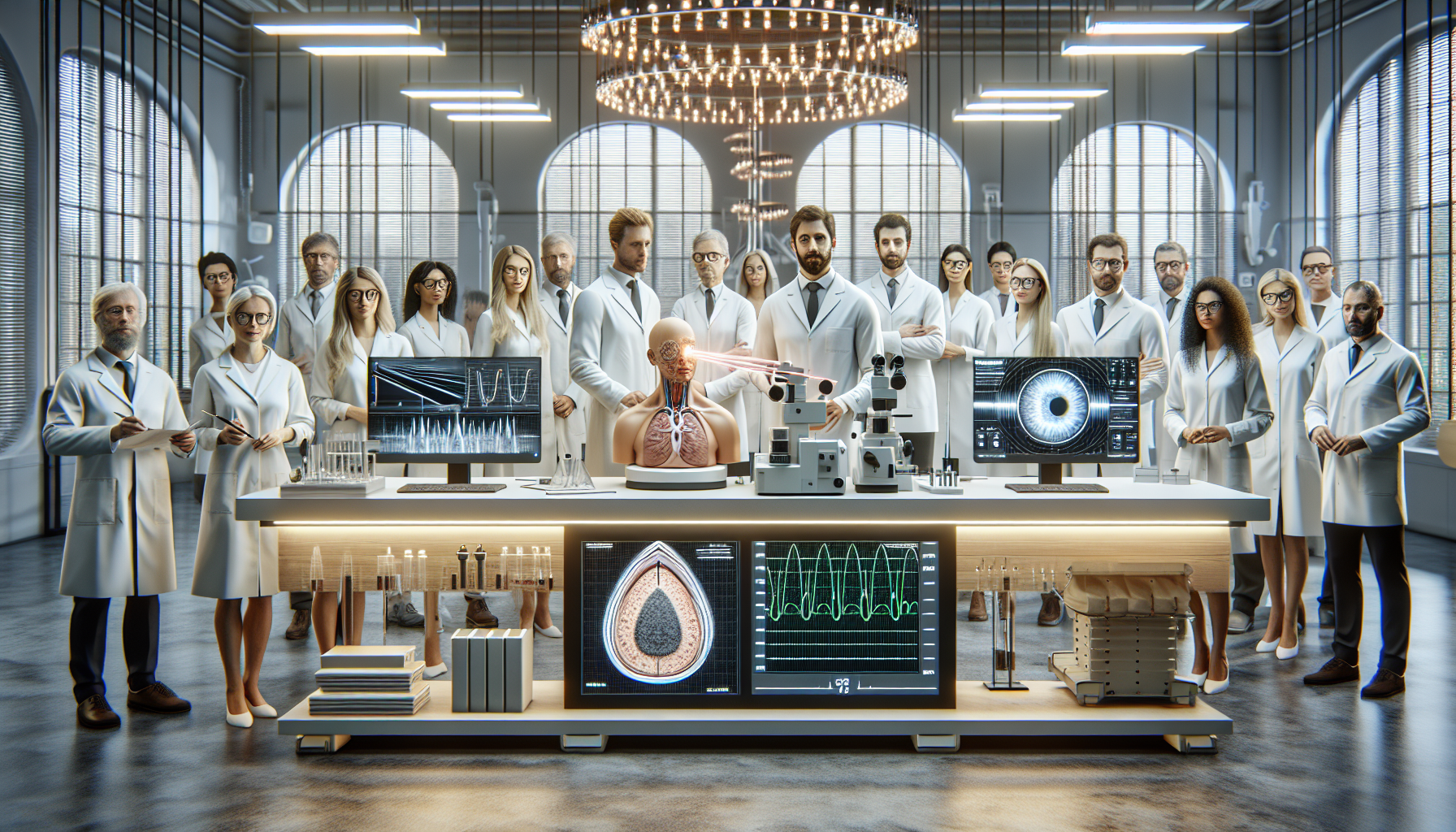Finnish researchers at Aalto University showcasing a laser device for treating dry macular degeneration in a lab setting.