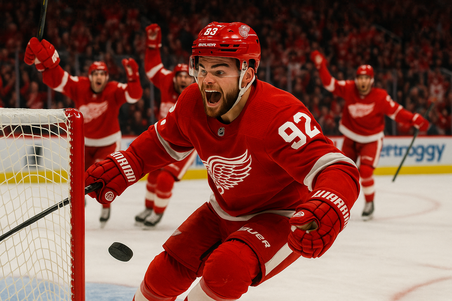 Detroit Red Wings forward Alex DeBrincat celebrating a goal, named NHL's Second Star of the Week for his five goals and one assist performance.