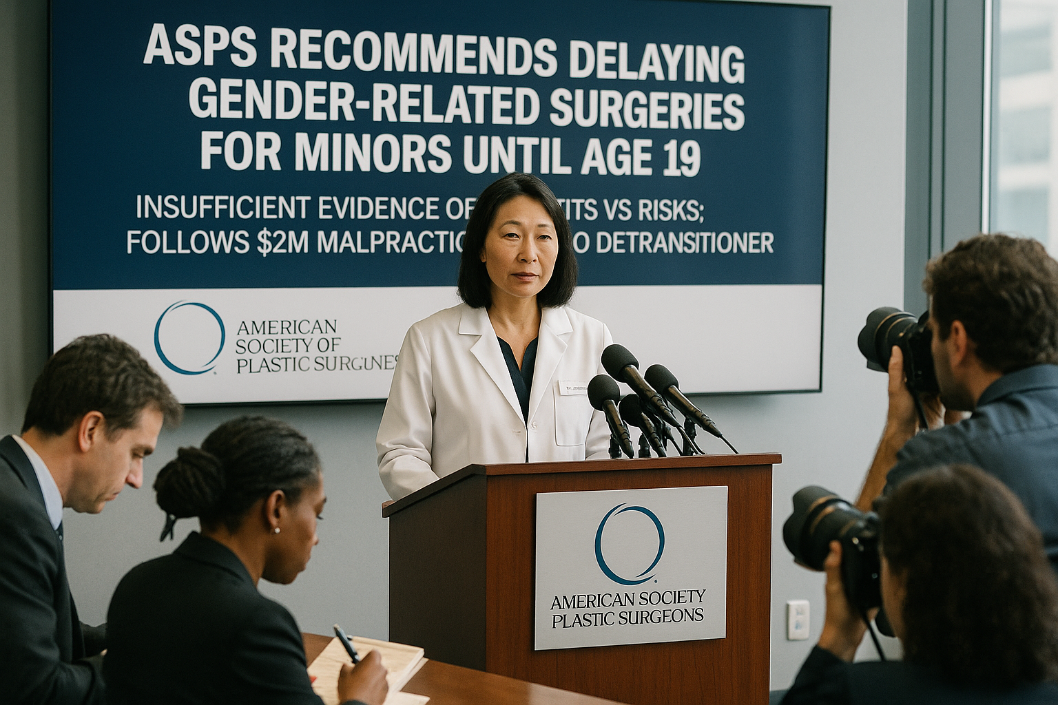 The American Society of Plastic Surgeons has recommended delaying gender-related surgeries for minors until age 19, citing insufficient evidence of benefits outweighing risks. This policy shift follows a $2 million malpractice award to a detransitioner who underwent a double mastectomy at 16. The statement marks a departure from prior medical consensus on pediatric gender care.