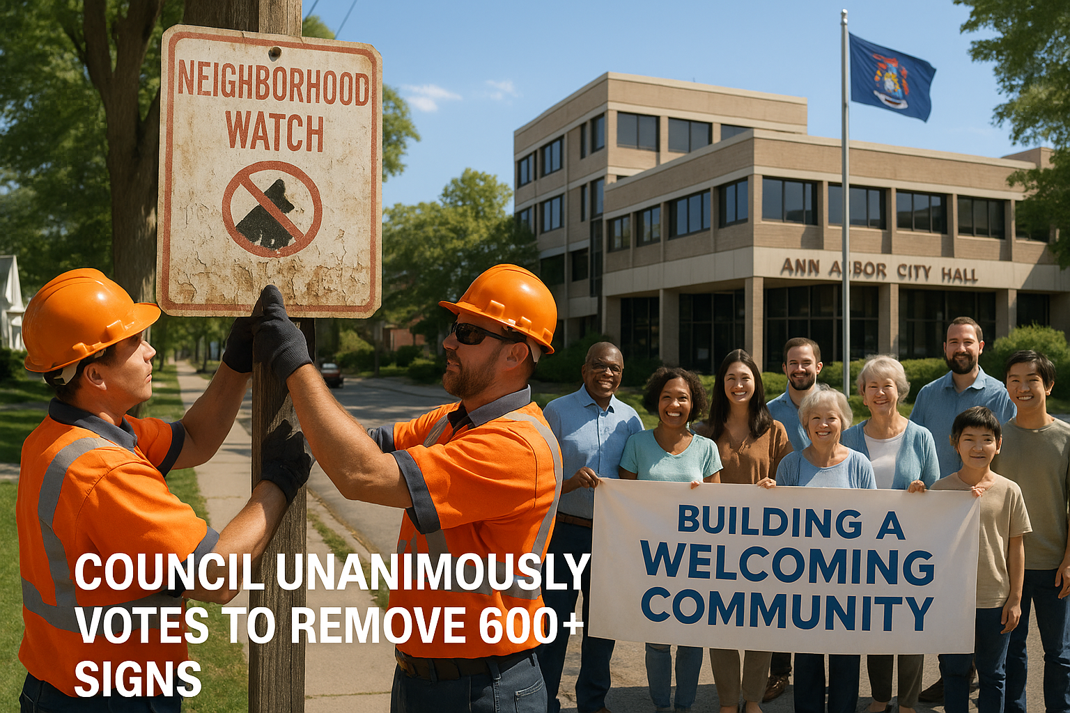City workers in Ann Arbor removing a neighborhood crime watch sign, watched by a diverse, supportive community, illustrating the council's vote for inclusivity.