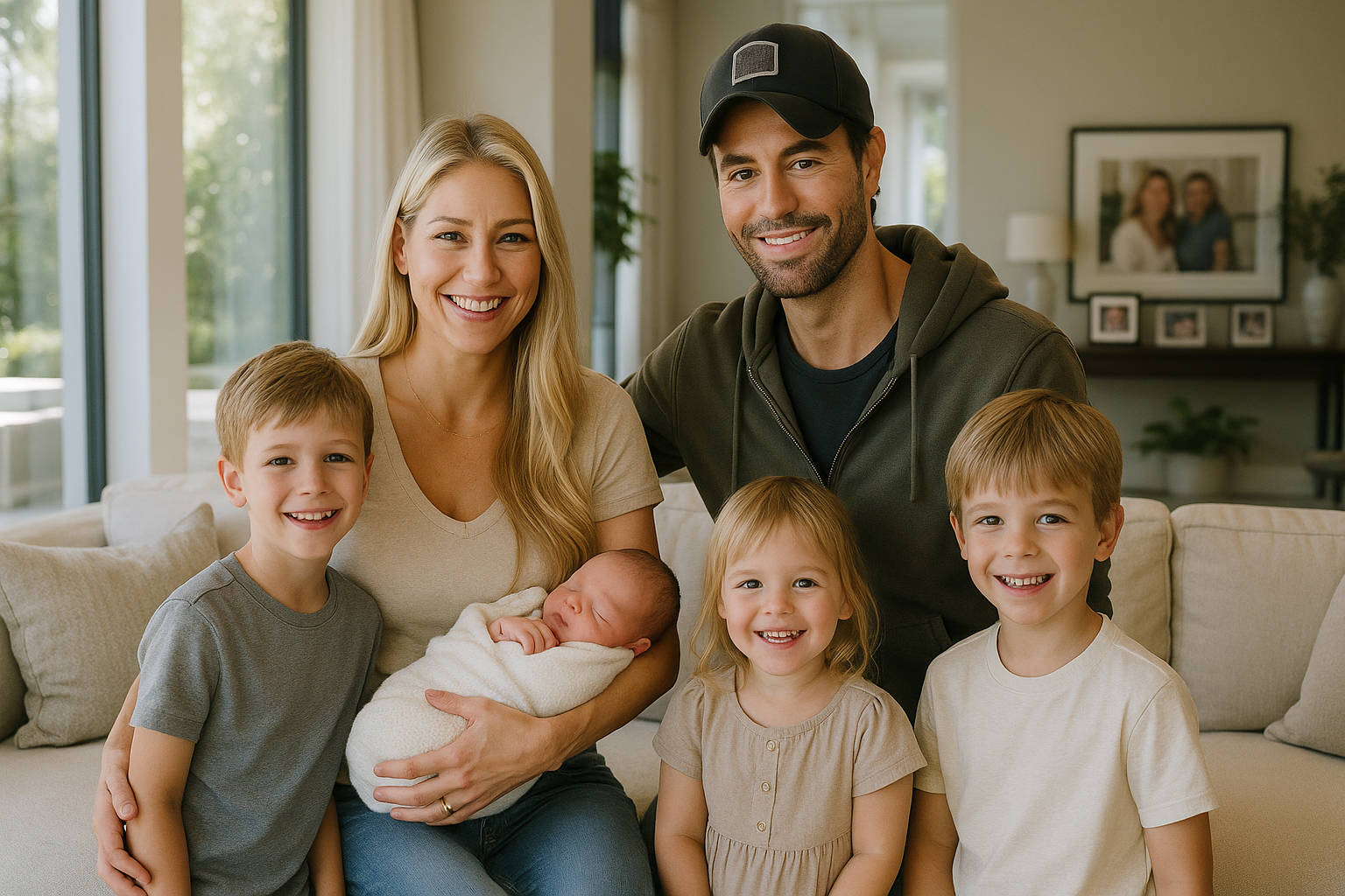 Anna Kournikova and Enrique Iglesias posing happily with their four children, including newborn, in a family home setting.