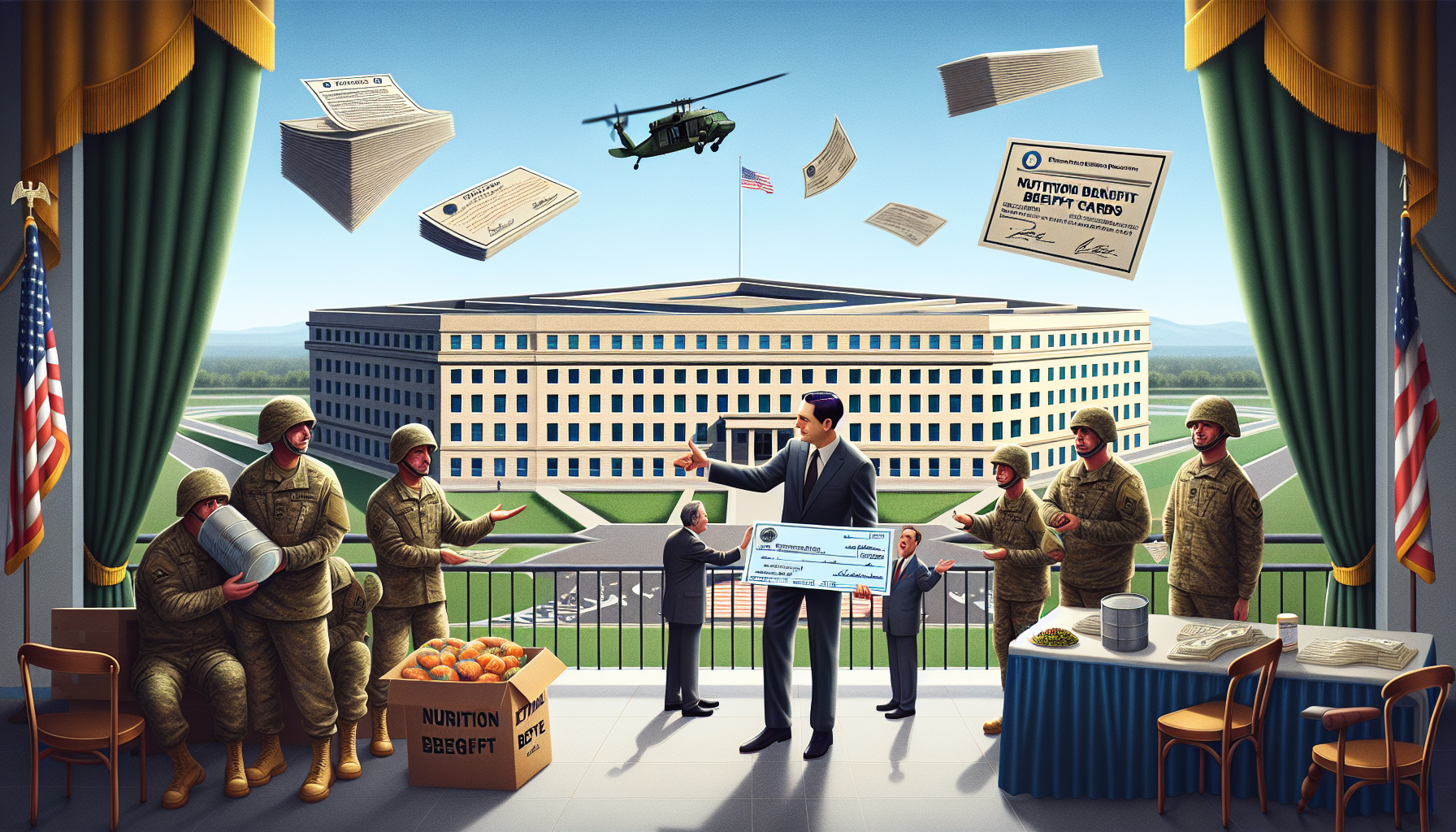 Illustration of the Pentagon accepting a $130 million donation to pay troops amid government shutdown, with soldiers, a large check, and President Trump in the scene.