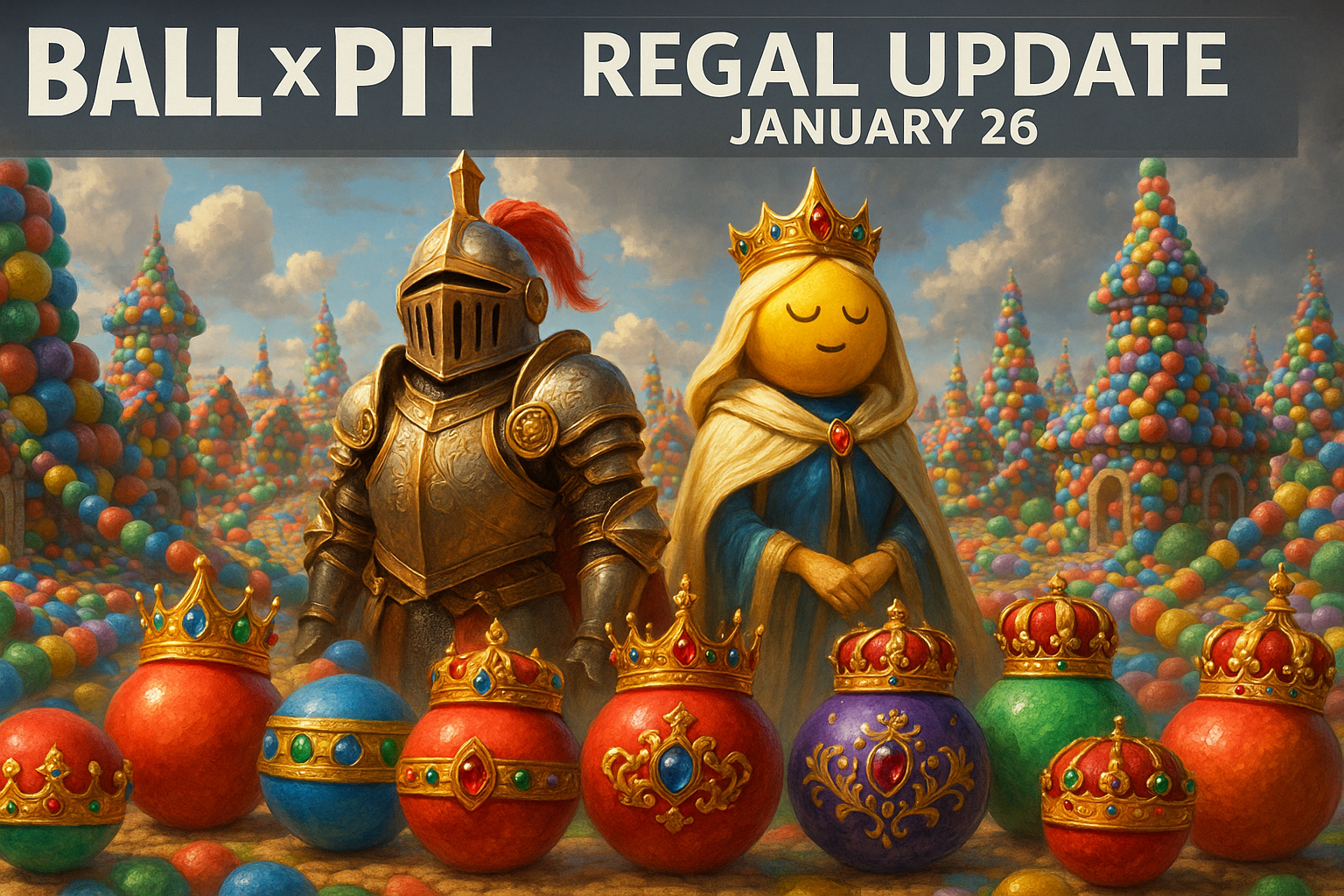 Realistic illustration of Ball x Pit's Regal update, showing new regal characters, shiny balls, and a ball-built town for the January 26 launch news.