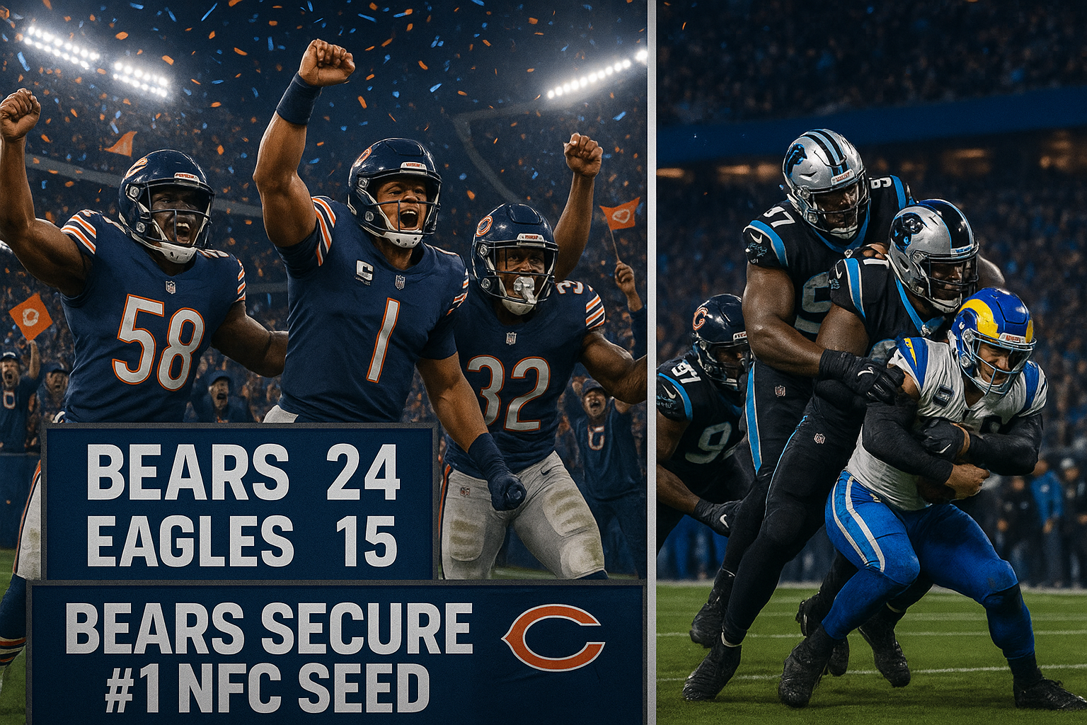 Chicago Bears players celebrate clinching the No. 1 NFC seed after their win and Panthers' upset over Rams, NFL playoff graphic.