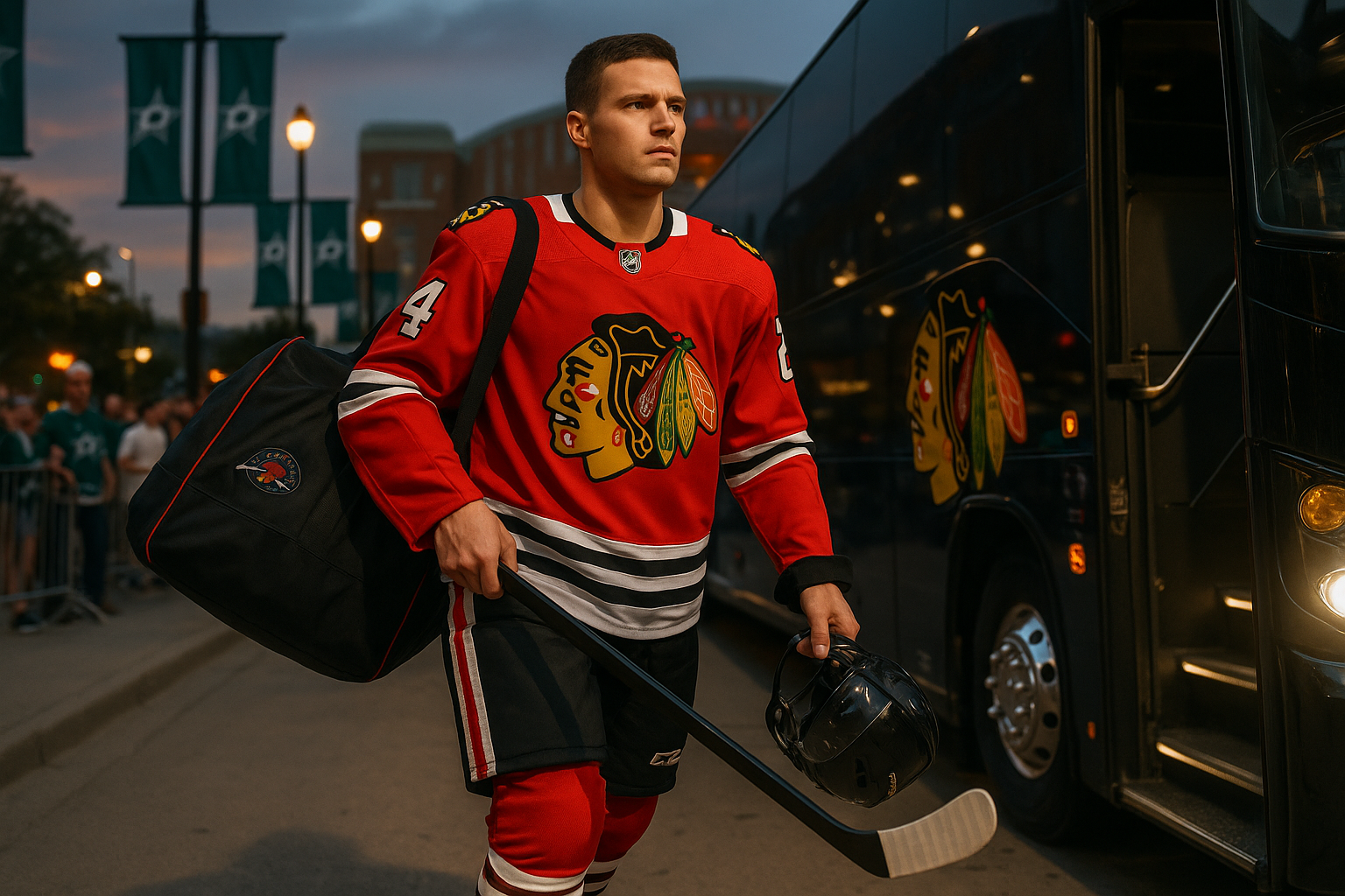 Chicago Blackhawks forward Landon Slaggert arriving in Dallas with team gear after recall from IceHogs, ahead of Stars game.