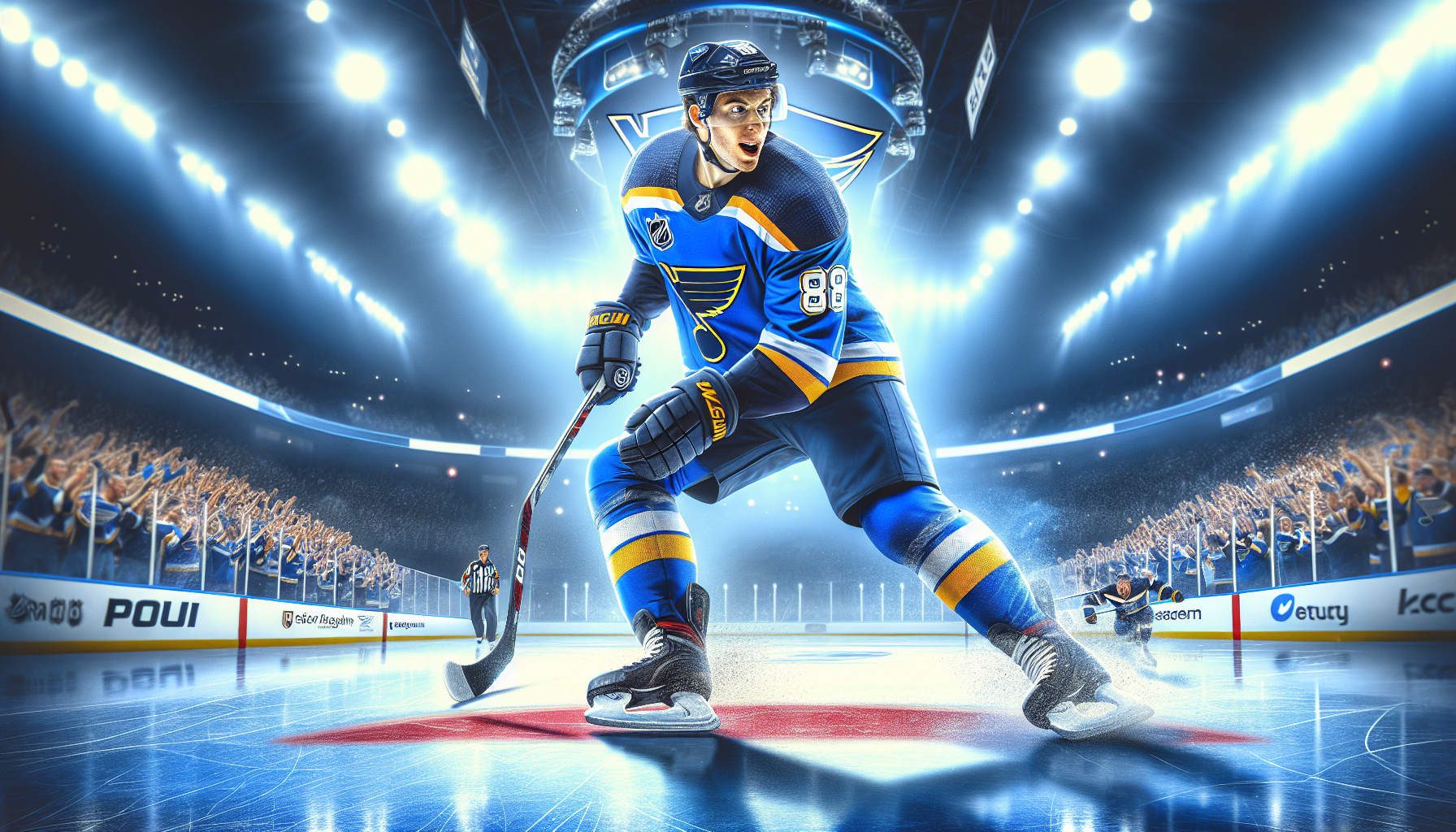 Hockey player Calle Rosén in St. Louis Blues jersey skating on ice, illustrating his trade from the Washington Capitals to the Blues.