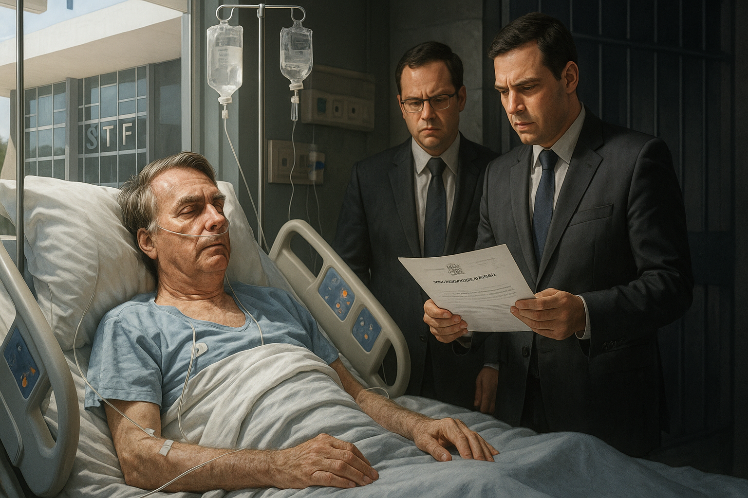 Illustration depicting Jair Bolsonaro in prison seeking medical surgeries and house arrest due to health decline, with lawyers petitioning STF Justice Alexandre de Moraes.