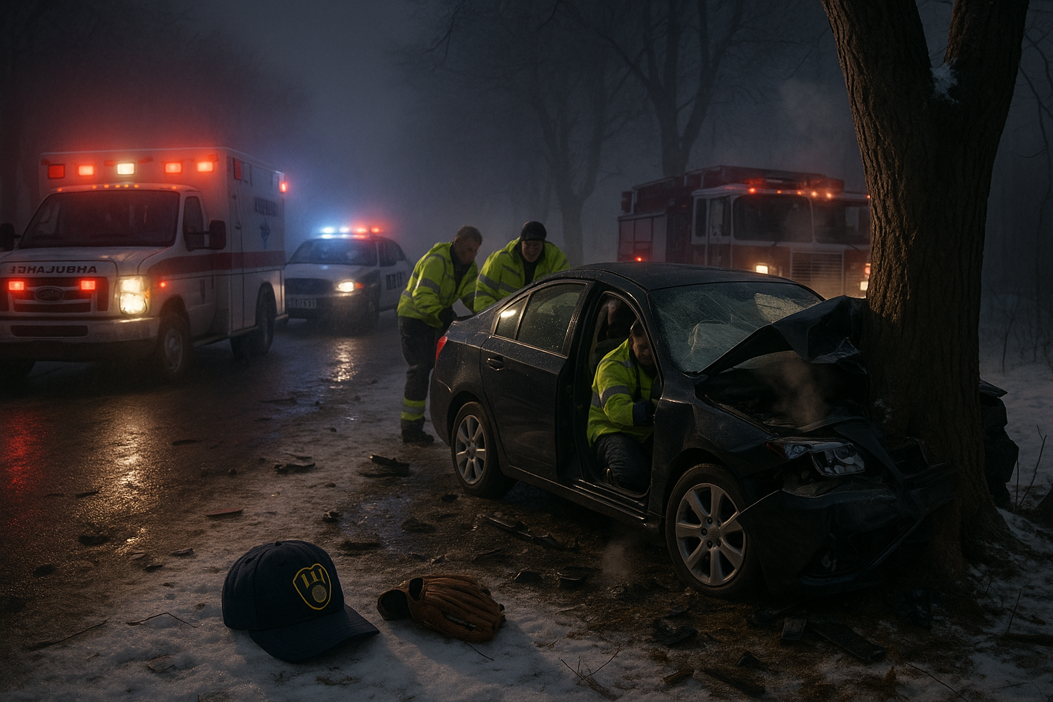 Illustration depicting the car crash scene in Franklinville, NJ, that hospitalized Milwaukee Brewers prospect Frank Cairone, with emergency vehicles and team memorabilia.