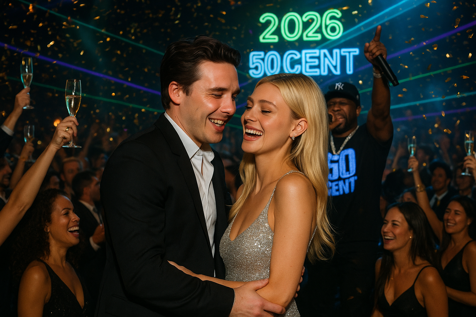Brooklyn Beckham and Nicola Peltz smiling and dancing at a Miami NYE 2026 party with 50 Cent on stage, paparazzi-style shot.