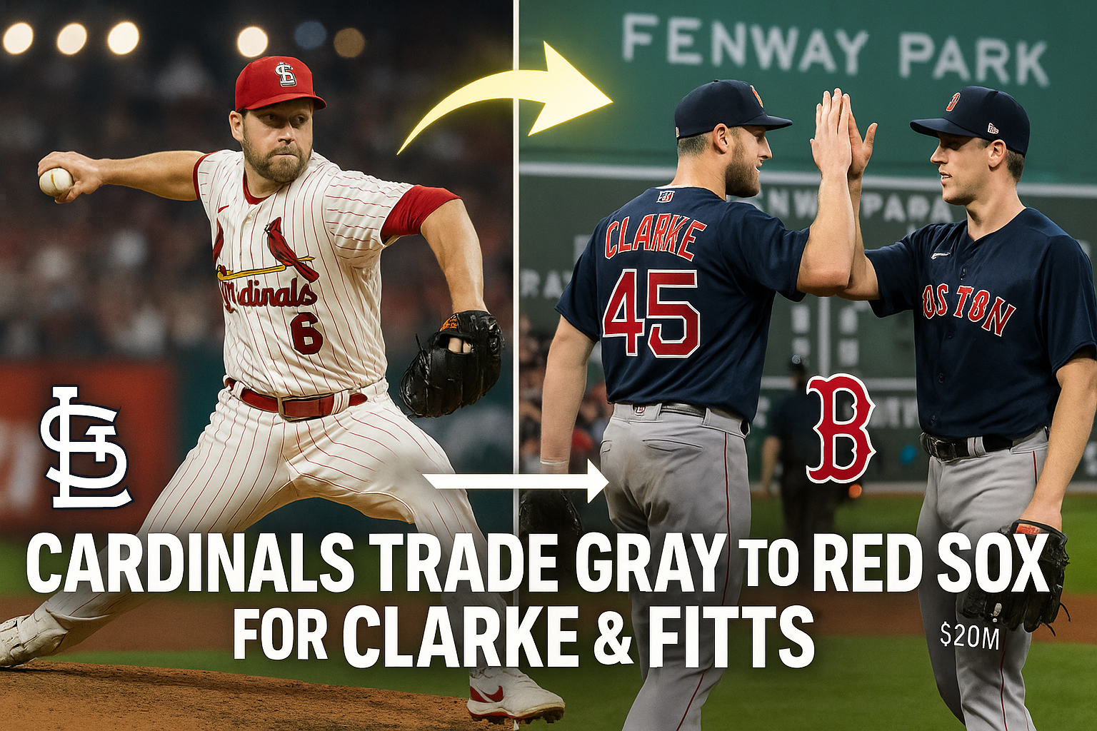 Illustration of Cardinals trading Sonny Gray to Red Sox for pitchers Clarke and Fitts.