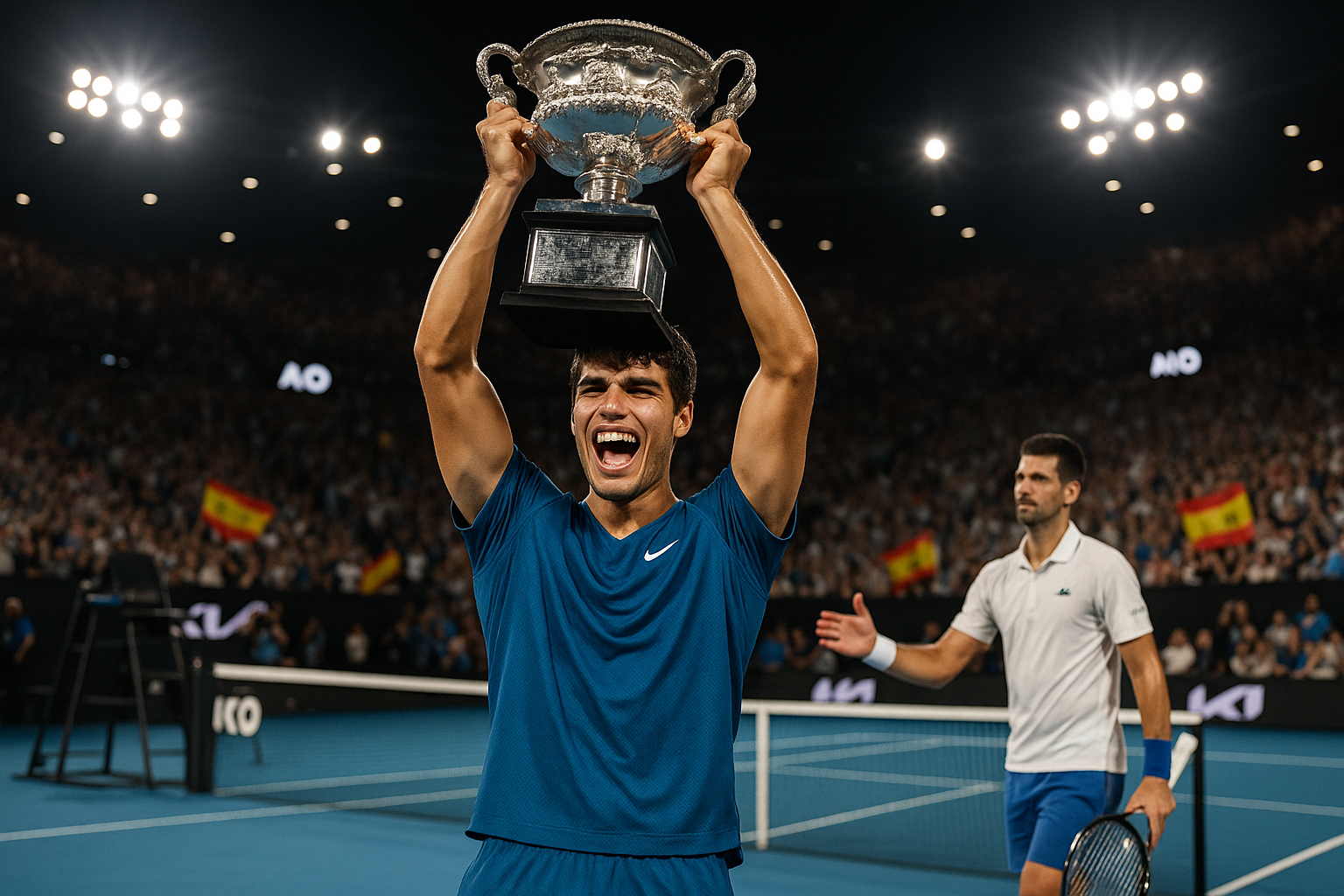 Carlos Alcaraz won his first Australian Open title by beating Novak Djokovic 2-6, 6-2, 6-3, 7-5 in the 2026 final, becoming the youngest man to achieve a career Grand Slam at age 22. The victory marked Djokovic's first loss in an Australian Open final, denying him a record 25th major. Alcaraz's triumph solidifies his position as world No. 1 with a commanding lead in the rankings.