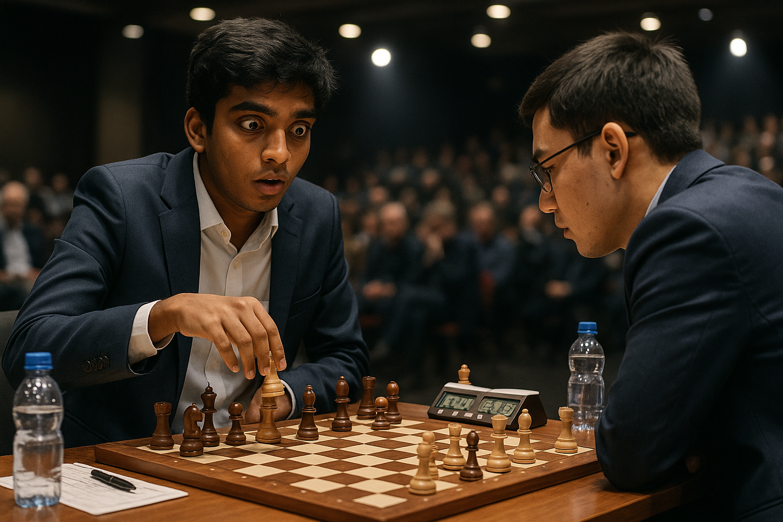 Dramatic illustration of world champion D Gukesh's shocked reaction to his blunder against Abdusattorov at Tata Steel Chess, dubbed 'chess blindness' by Fabiano Caruana.