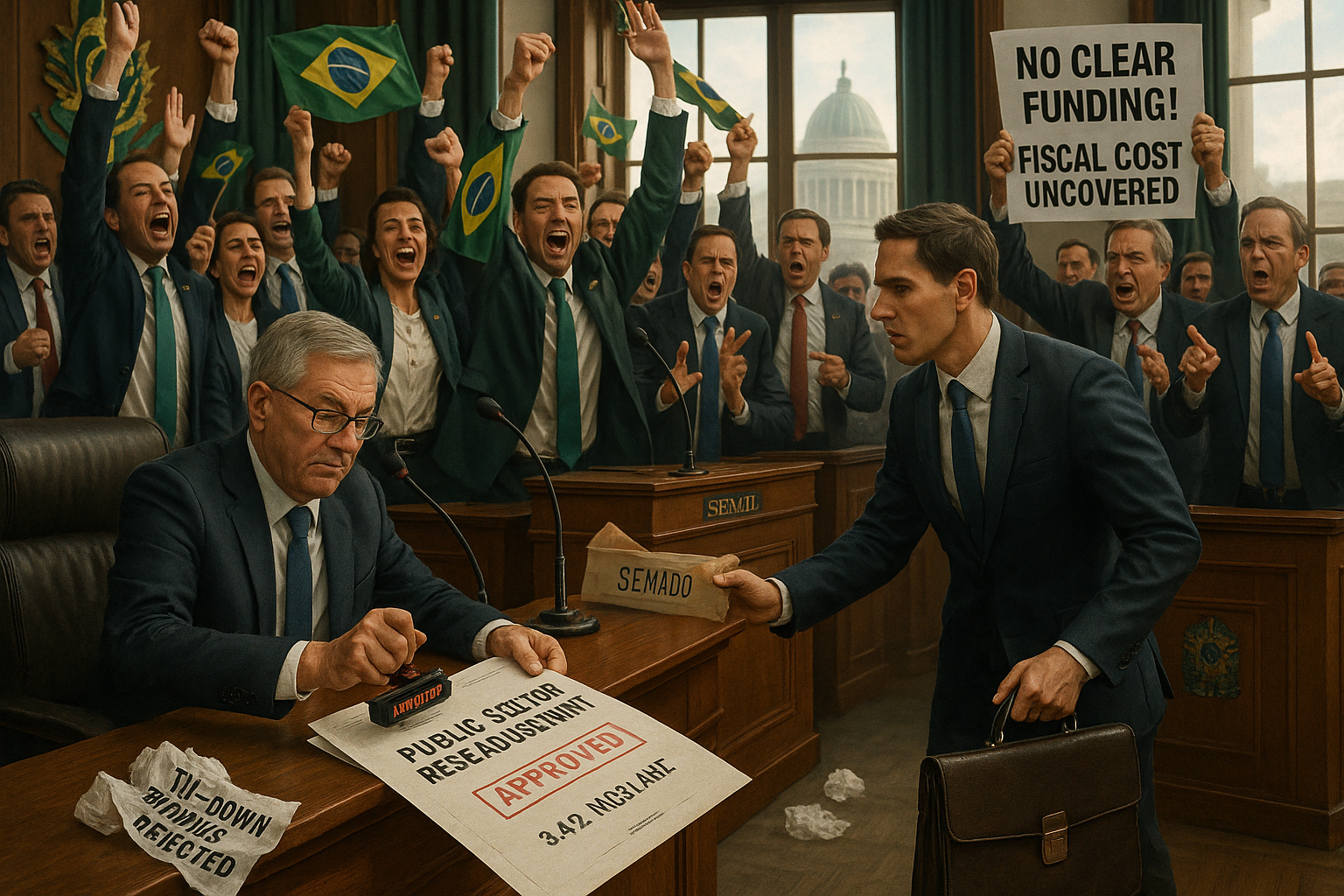 Dramatic illustration of Chamber of Deputies approving public sector 3.4% salary bill, rejecting tie-down norms, and dispatching to Senate amid opposition funding concerns.