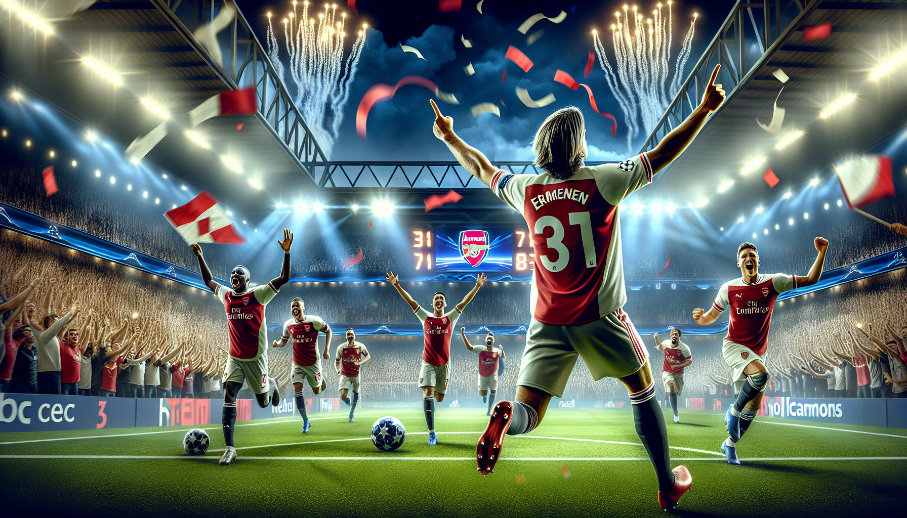 Dynamic photo illustrating the record 71 goals in Champions League matchday 3, featuring PSG players celebrating amid a thrilled stadium crowd.