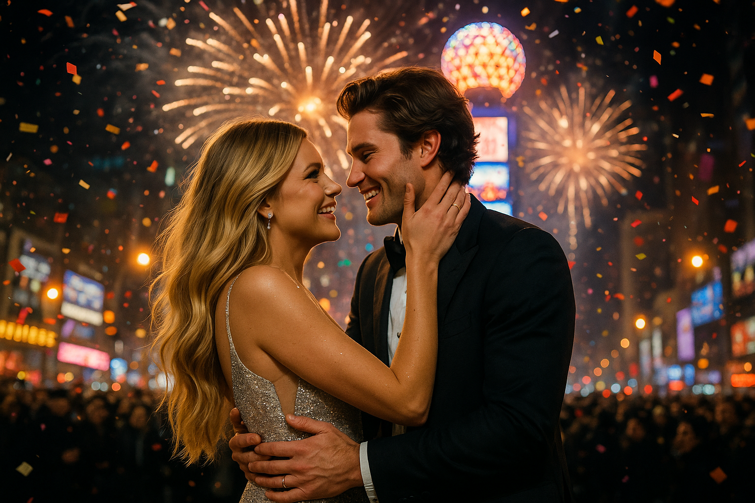 Chase Stokes and Kelsea Ballerini embrace romantically under New Year's Eve fireworks in Times Square, celebrating their rekindled romance.
