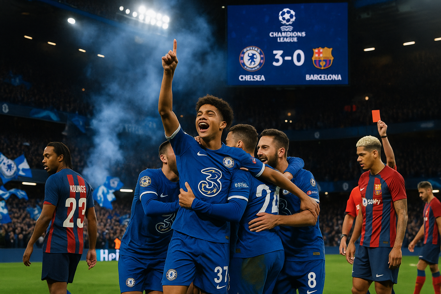 Chelsea delivered a dominant 3-0 win against Barcelona in the UEFA Champions League at Stamford Bridge, with goals from an own goal by Jules Kounde, a stunning solo effort by Estevao, and a finish from Liam Delap. The match saw Barcelona reduced to 10 men after Ronald Araujo's red card just before halftime. Estevao's performance highlighted Chelsea's rising young talent in a statement result.