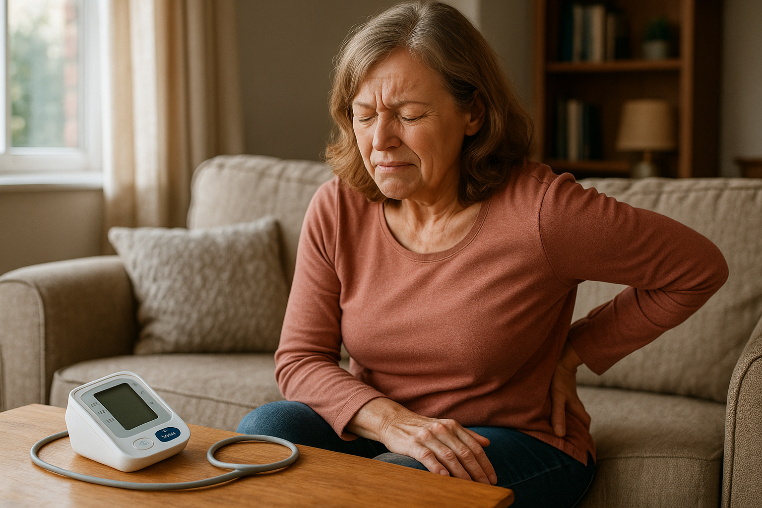 A realistic photo of a woman experiencing chronic pain next to a blood pressure monitor, representing the study's findings on pain and hypertension risk.