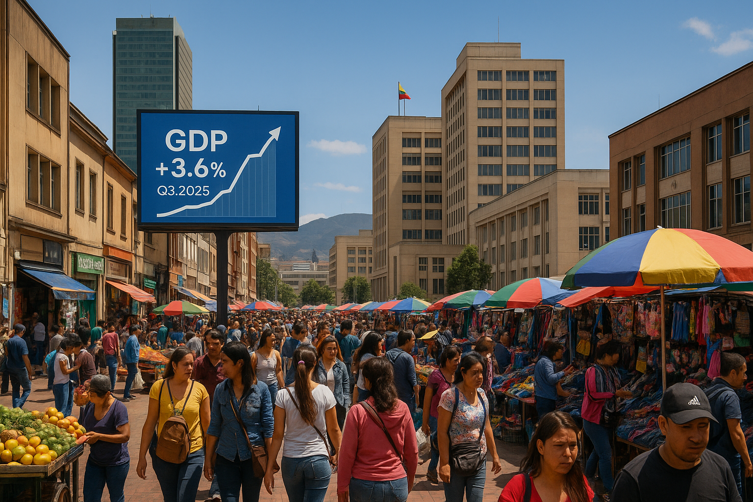 Vibrant Bogota street market with shoppers, rising GDP graph on billboard, representing Colombia's 3.6% economic growth in Q3 2025.