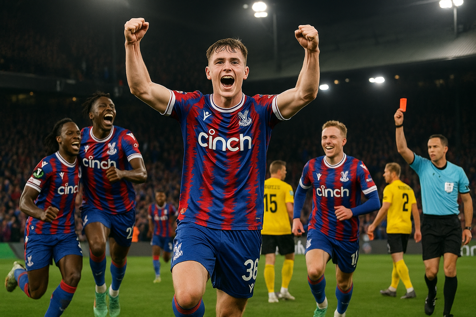 Crystal Palace celebrates late equalizer in thrilling 2-2 draw vs 10-man KuPS, securing Conference League playoff spot at Selhurst Park.