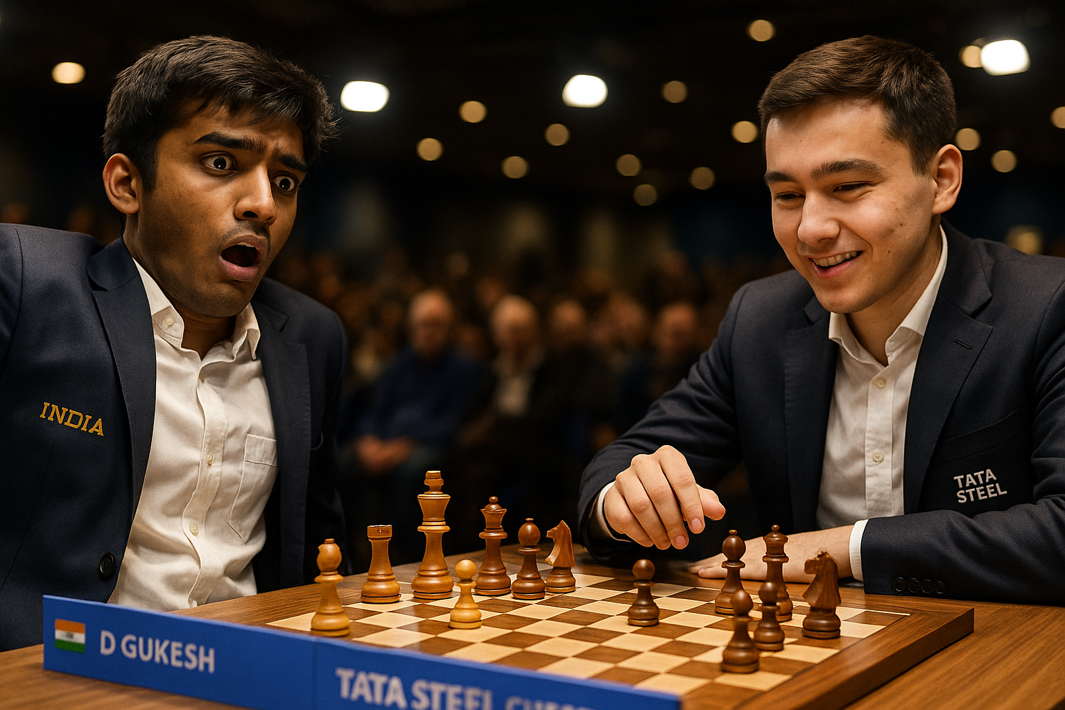 D Gukesh's shocked reaction to his blunder loss against Nodirbek Abdusattorov at Tata Steel Chess, capturing the critical board position.