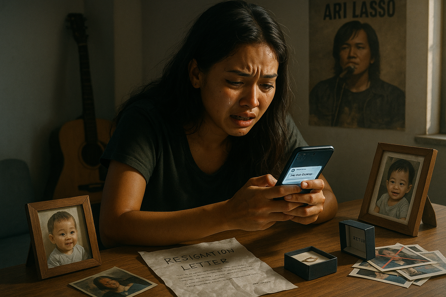 Emotional illustration of Dearly Joshua venting breakup frustrations on social media, showing symbols of her job sacrifice, child, gifts, and ex Ari Lasso.