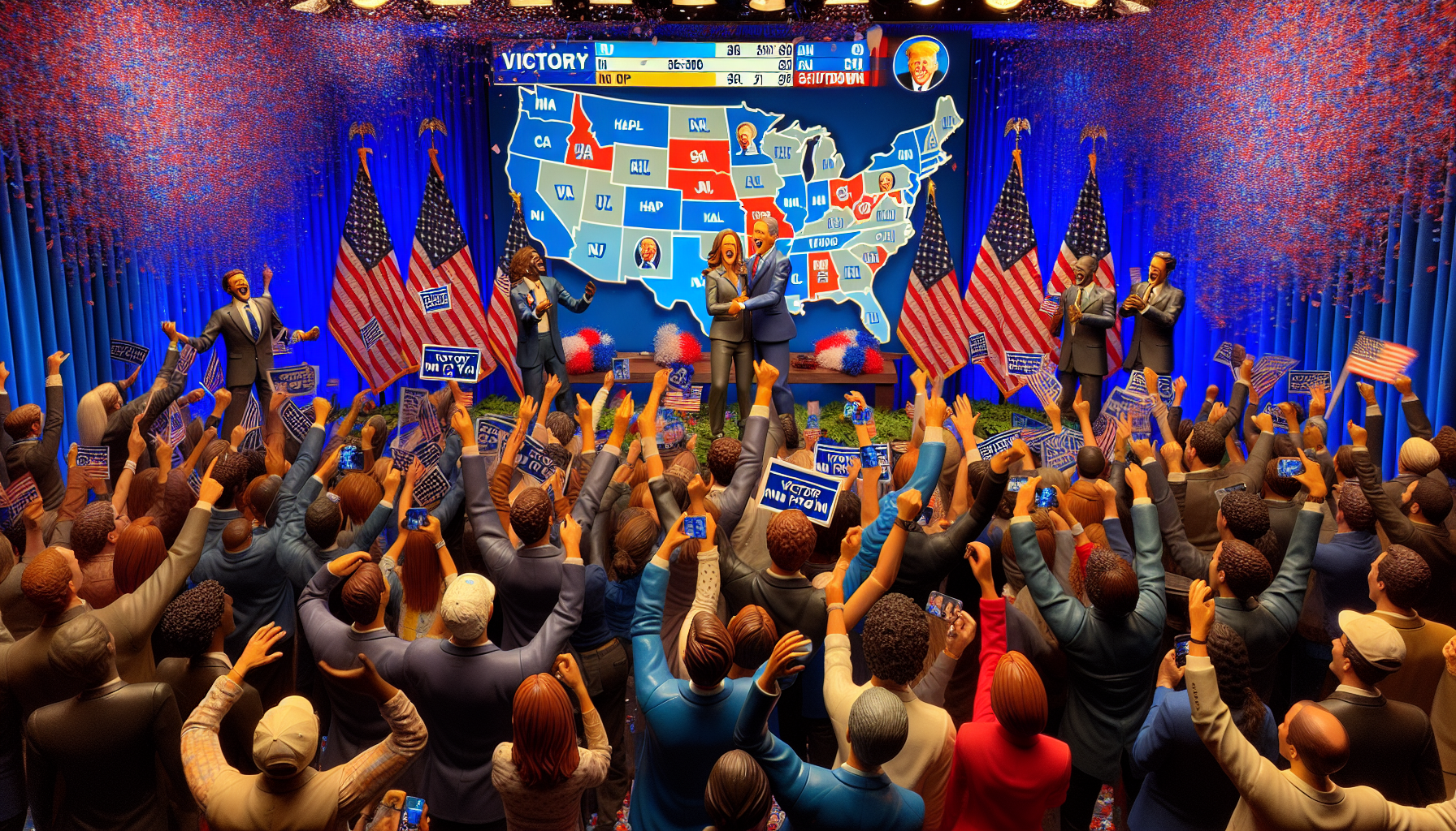 Jubilant crowd of Democratic supporters celebrating key election wins in Virginia, New Jersey, New York City, and California, with signs, flags, and maps.
