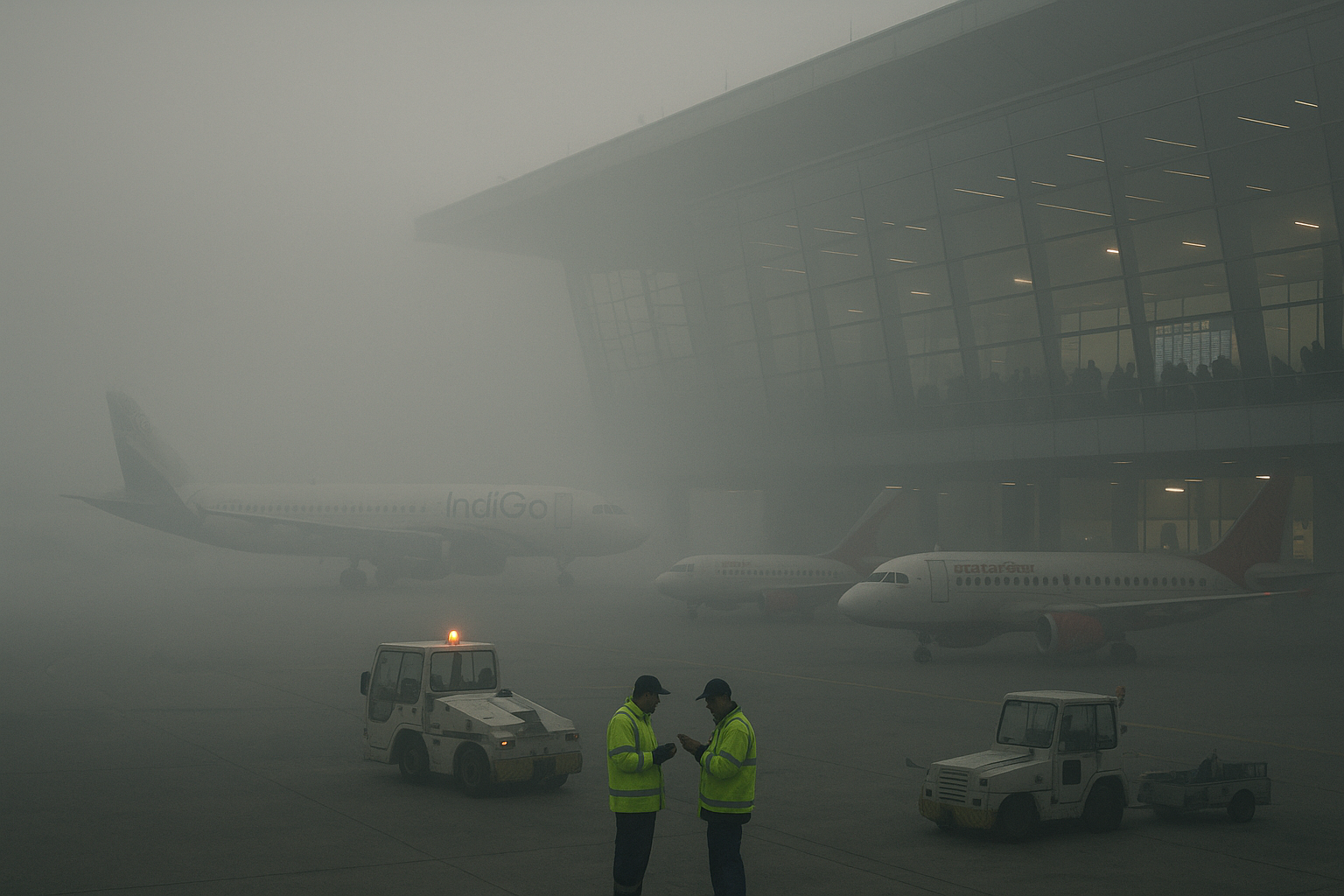 Dense fog envelops Delhi's Indira Gandhi International Airport, delaying flights and shrouding runways and terminals in heavy mist.