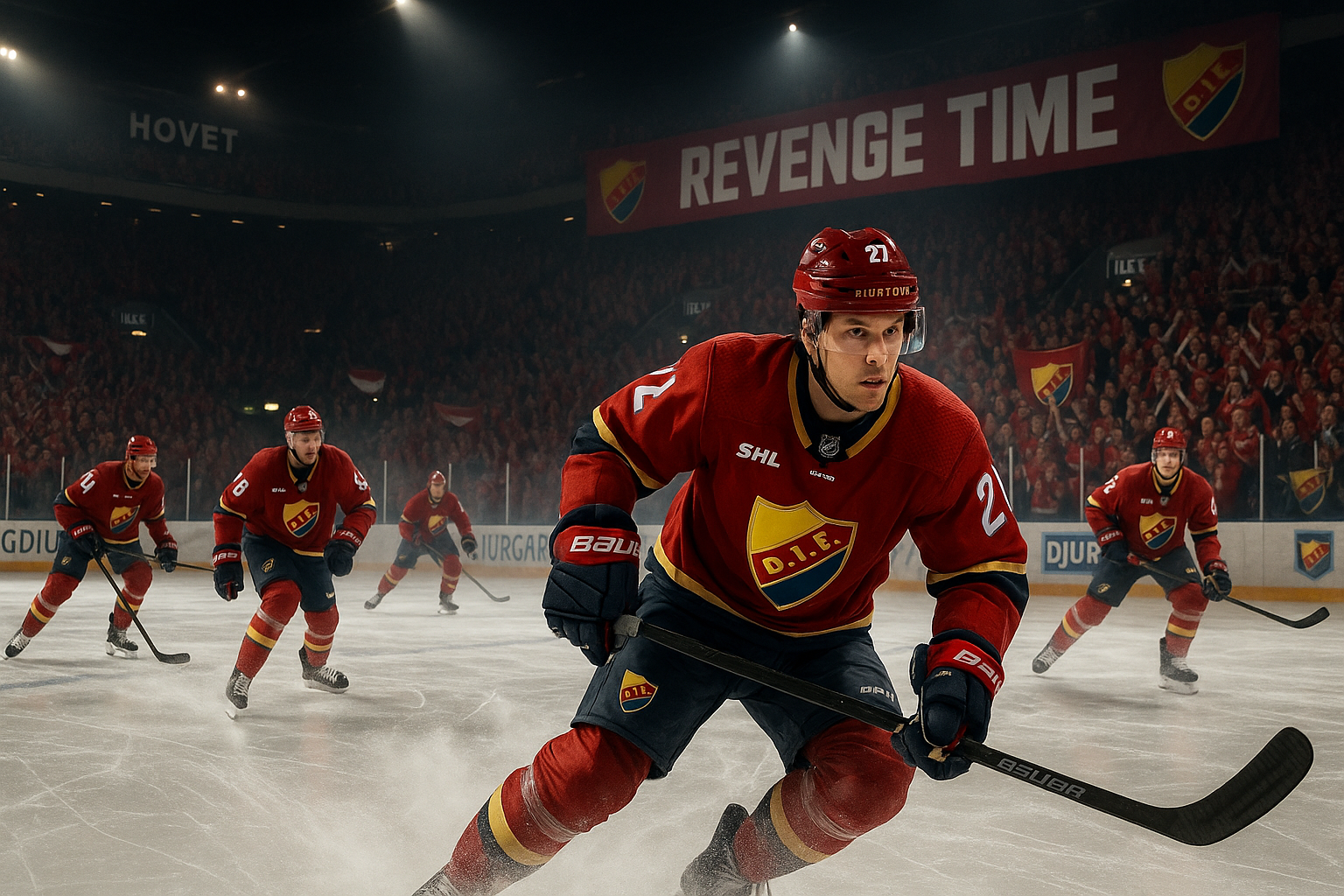 Djurgården hockey team prepares intensely at Hovet for revenge rematch against Färjestad amid rising tensions.