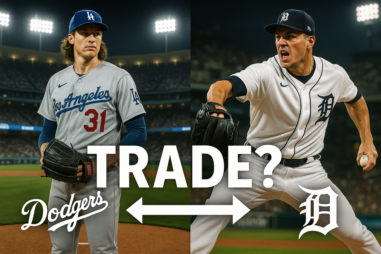 Illustration of Dodgers pitcher Tyler Glasnow and Tigers ace Tarik Skubal connected by a 'TRADE?' sign, highlighting potential MLB trade rumors.